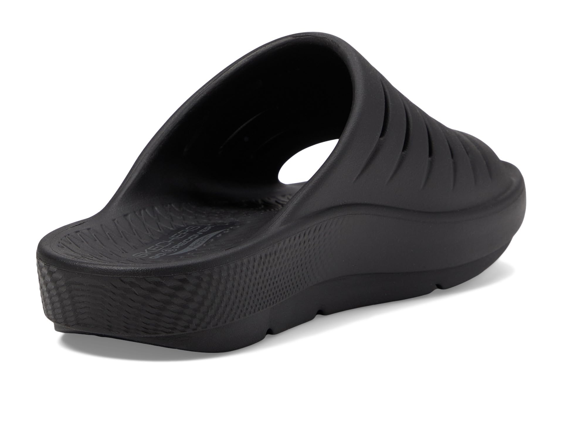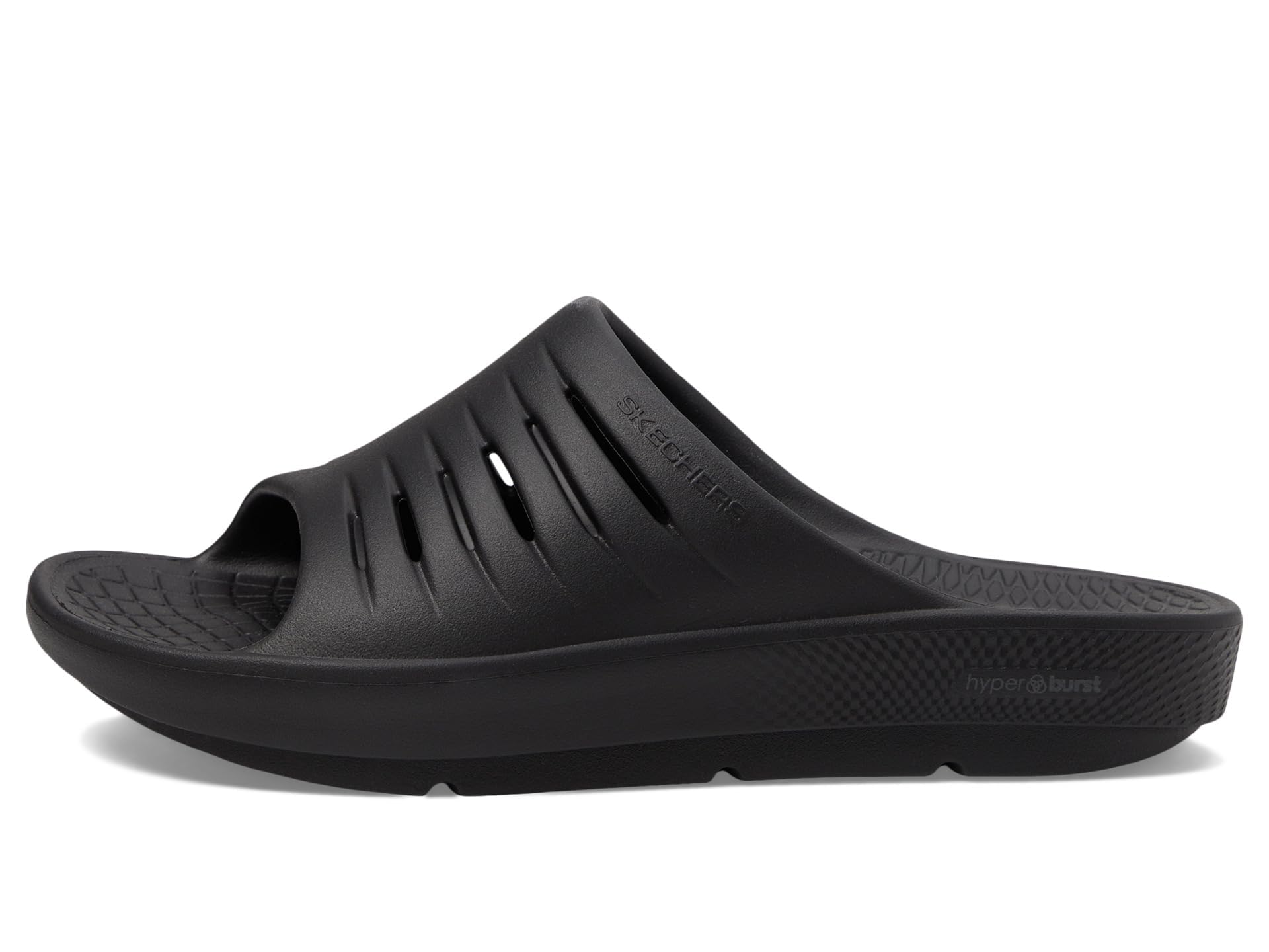 Description Post-sports recovery gets the spotlight with specialized comfort and style in Skechers GO Recover Refresh slide sandal. This athletic slide sandal features a synthetic leather upper with a HYPER BURST cushioned midsole and Arch Fit designed footbed. Machine washable.