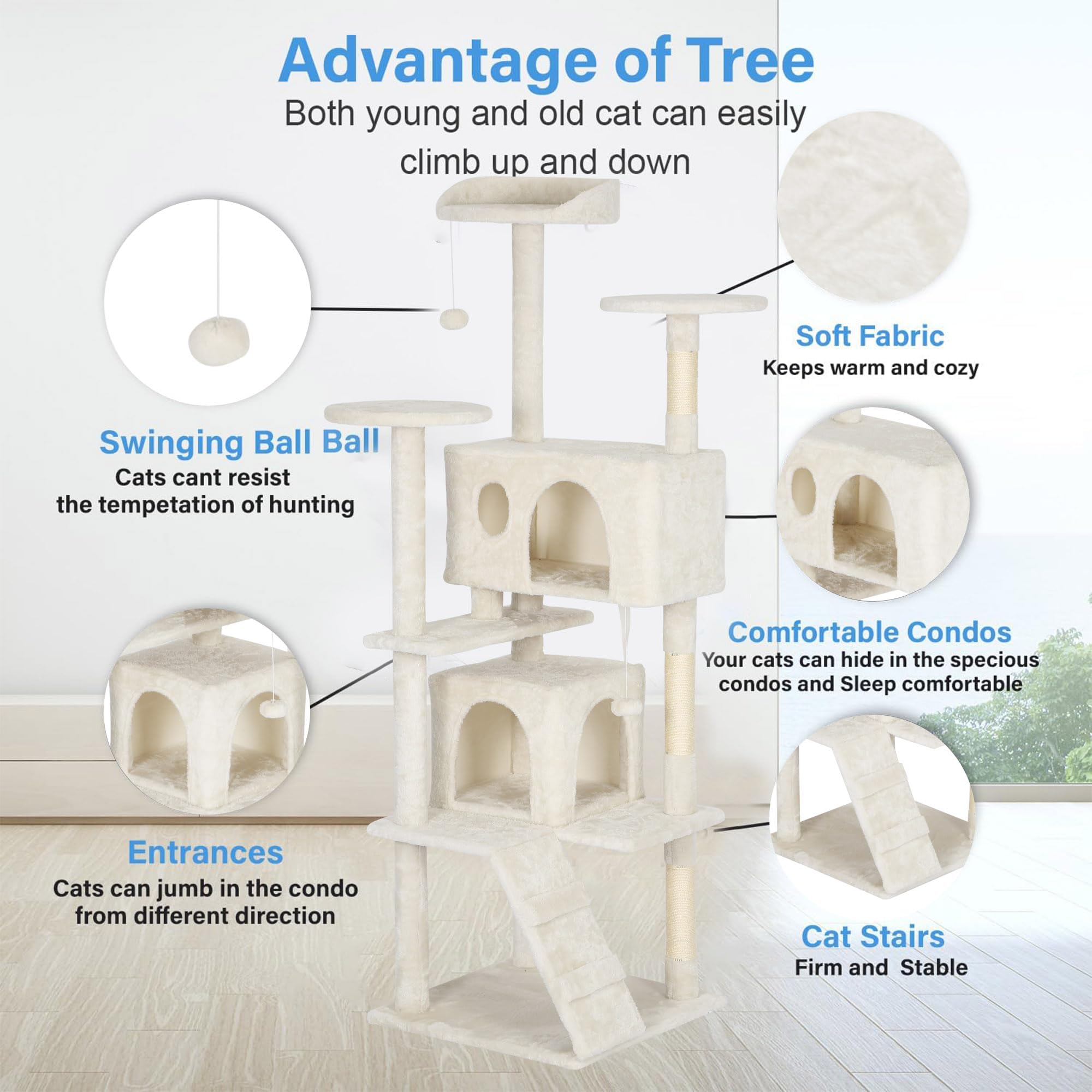 MULTI-LEVEL CAT TREE TOWER: This cat tree offers perches, ladders, and a cozy cat condo, creating the ultimate playground where cats of all ages can climb, scratch, nap, and explore freely.