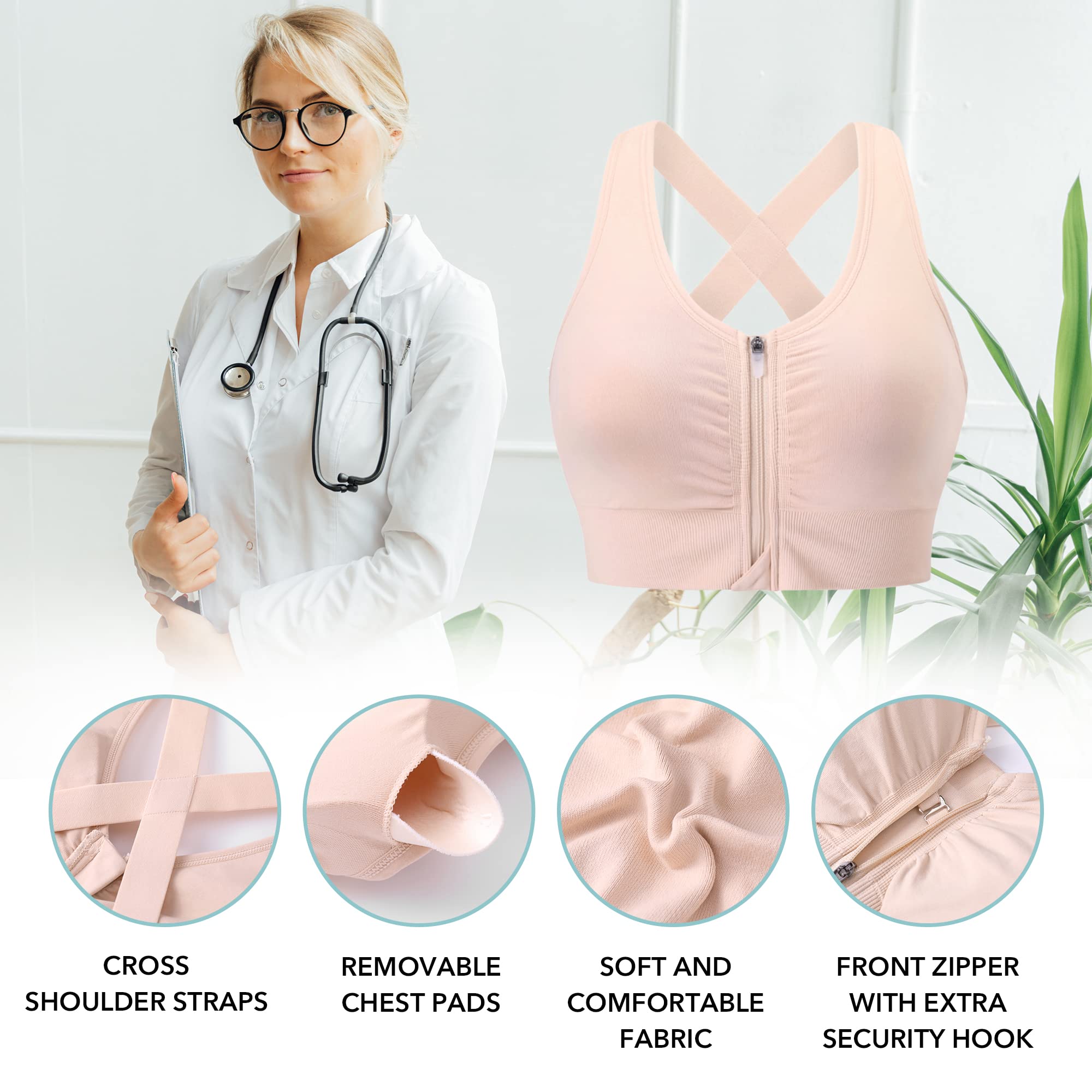 ZIP FRONT CLOSURE:This post-surgical bra features a zip front closure with no underwire, providing ultra-soft texture and excellent breathability to maximize comfort. The zip front closure allows for easy on and off and takes care of the arm that you are unable to lift. Additionally, the zipper has an anti-scratch device, ensuring it remains in place throughout the day. The top has a cloth flap that prevents it from poking you, and you won't even notice it's there after you put it on.