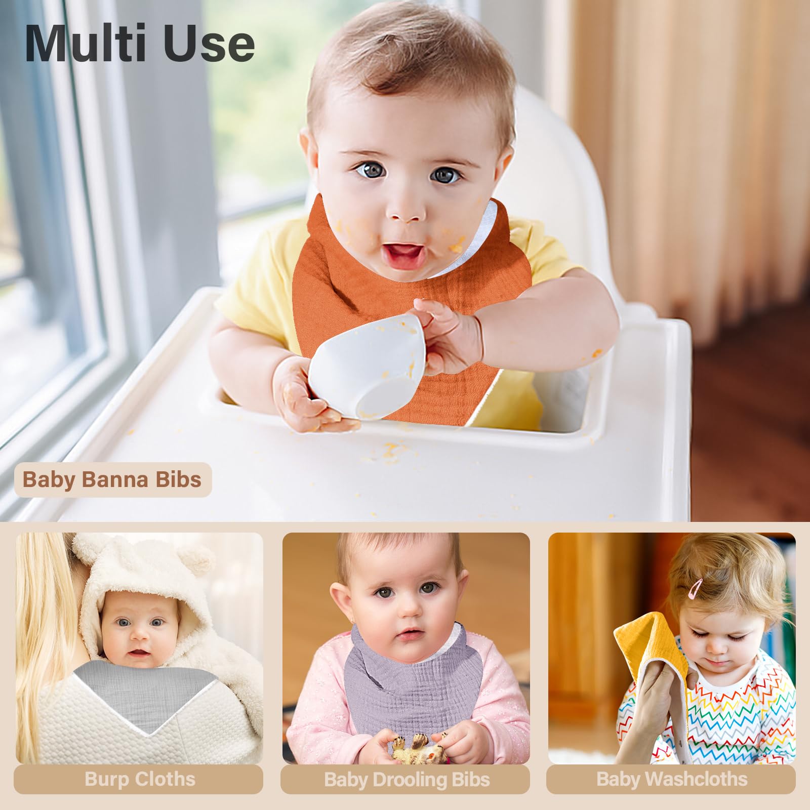 【Adjustable Toddler Bibs】: With the considerate inclusion of 2 nickel-free snaps,our cotton baby bib can be effortlessly adjusted from 13-15.5inch, providing a comfortable fit for your baby's neck. These muslin bibs will beautifully suit newborns and babies up to 36 months.