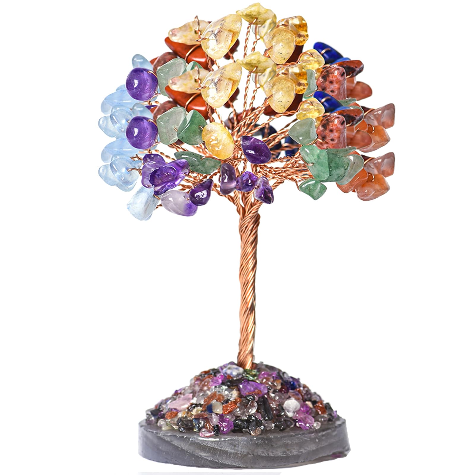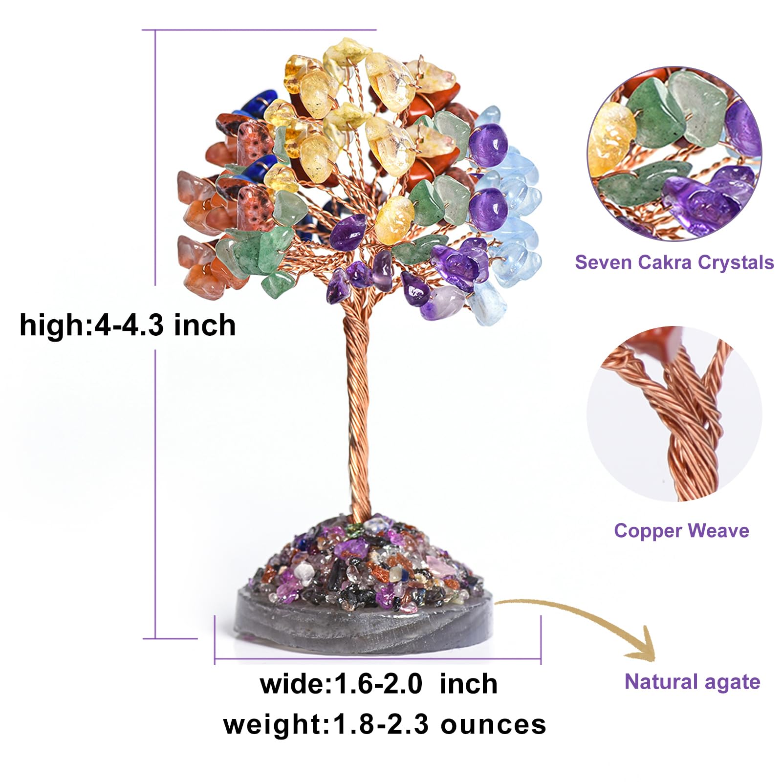 [Basic Information]Seven Chakra Tree weight:1.8-2.3 ounces, Material:Seven Chakra crystal, agate slices, copper wire , Base size of the tree: 1.6-2.0 inch, height of the tree: 4-4.3 inch, This Beautiful Seven Chakra crystal tree in office desk accessories and spiritual gifts for women,symbolizing luck, prosperity and wisdom.