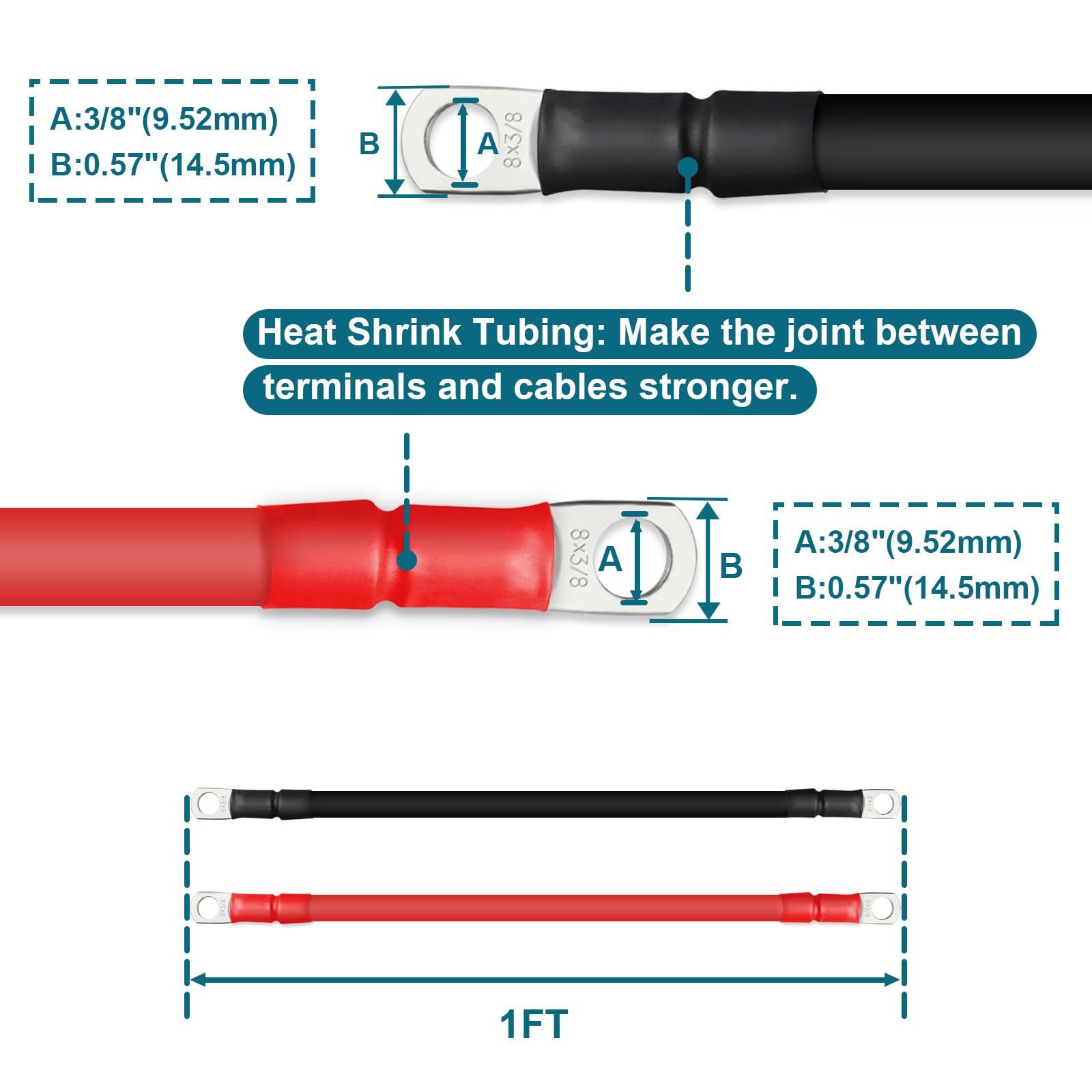 Strong Structure: Solid terminals on the both sides of the battery cable allow you to connect more easily. In addition, the heat-shrinkable tubing makes the joint between terminals and cables stronger, ensuring safety.