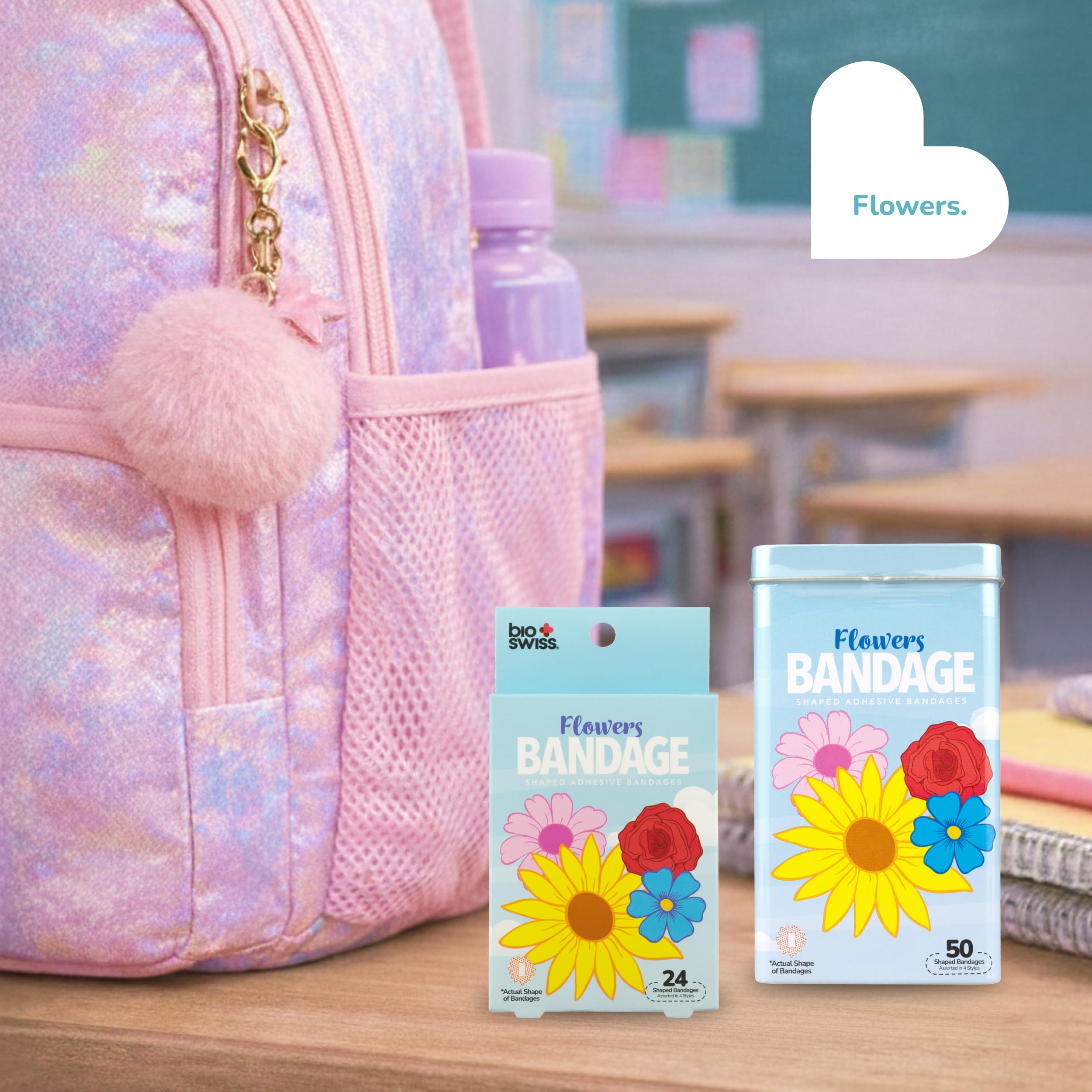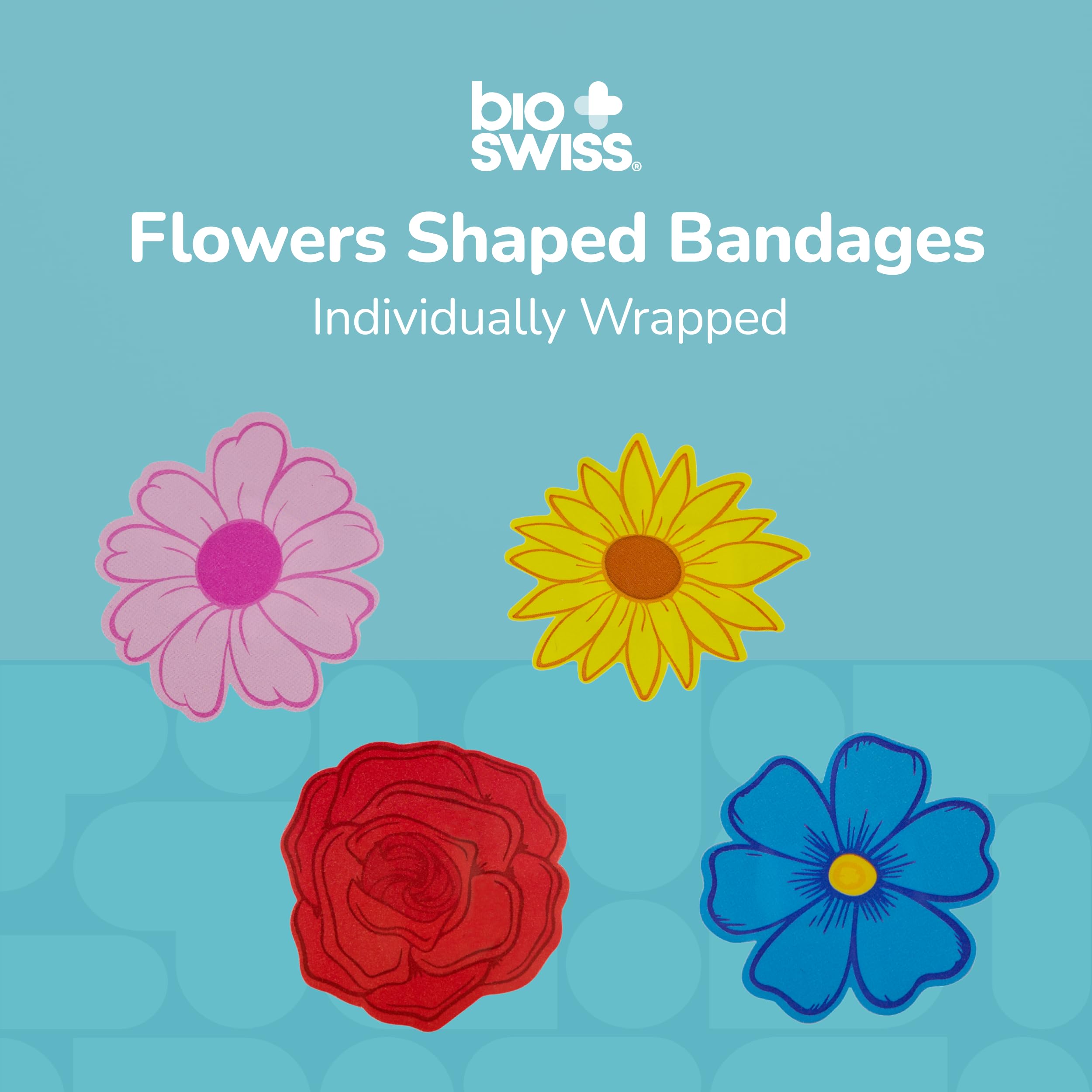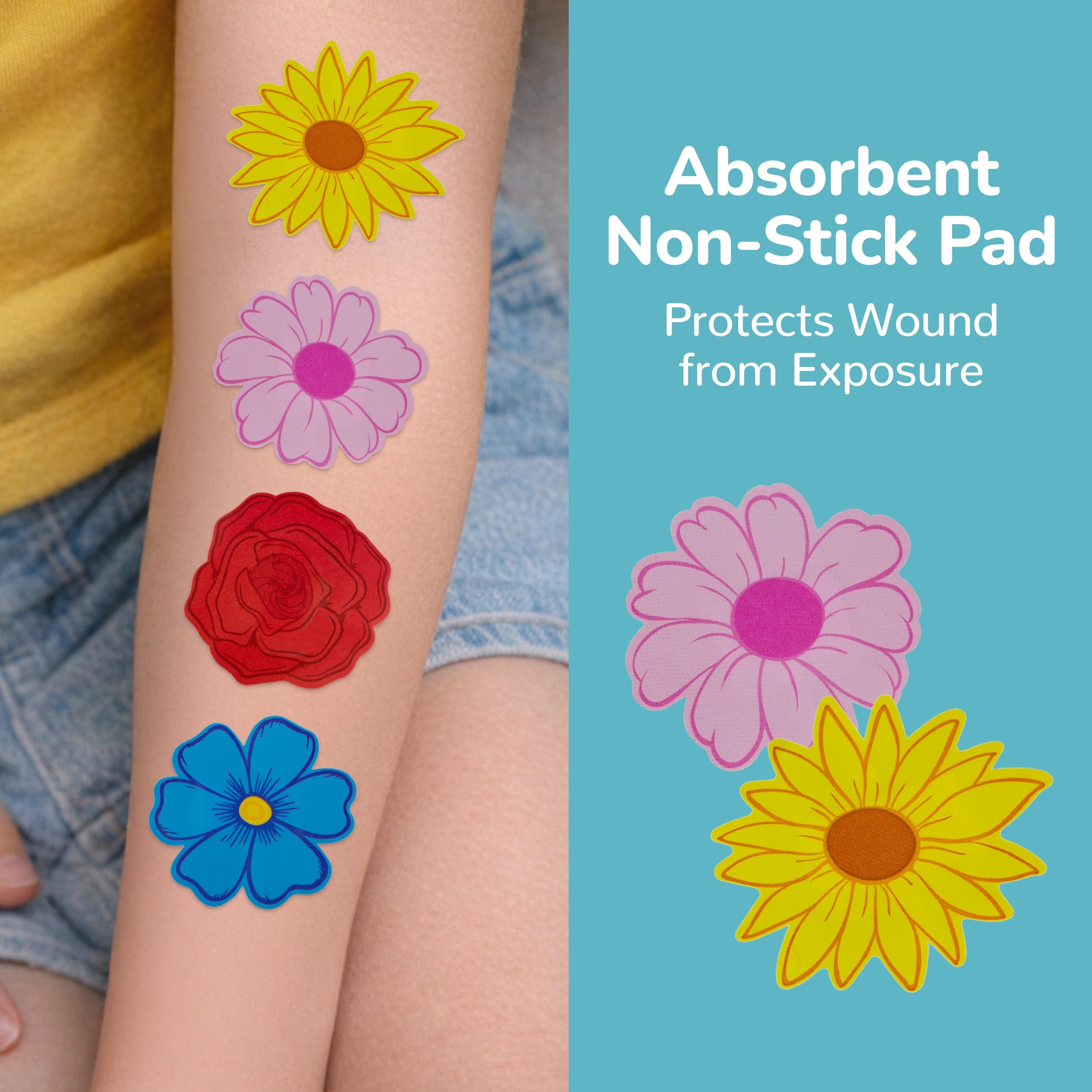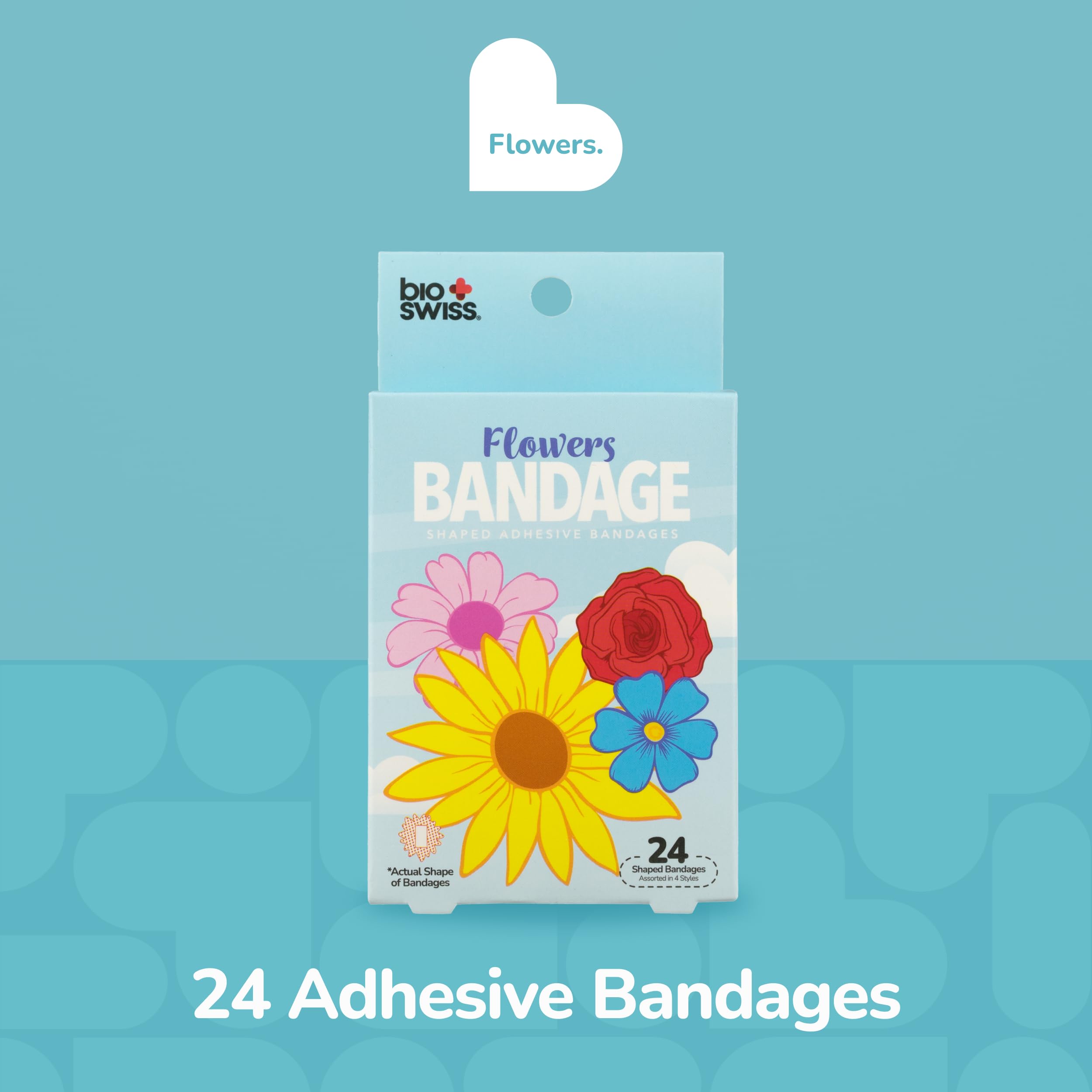 24 FLOWER BANDAGES: Flower-shaped adhesive bandages pack helps protect cuts, scrapes, and minor wounds while making healing less stressful; bandages come in 4 assorted styles