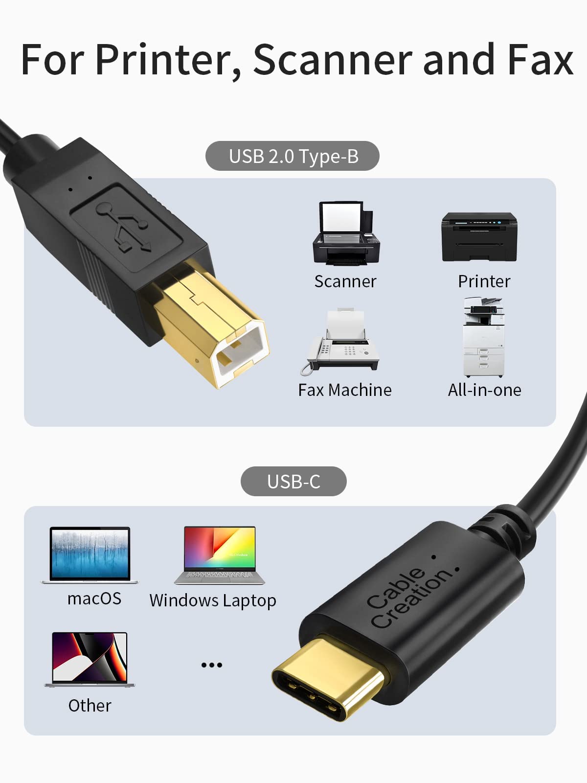Tips for Buyer: 1. This USB C to USB 2.0 B cable does not have compatibility issues, as long as your device has the appropriate interface, you can use it. 2. The cable does not require any driver or program, but the printer or scanner may need to install a driver on your computer. If the laptop is not working for macOS and Windows, you need to download the driver from the official website of the printer.