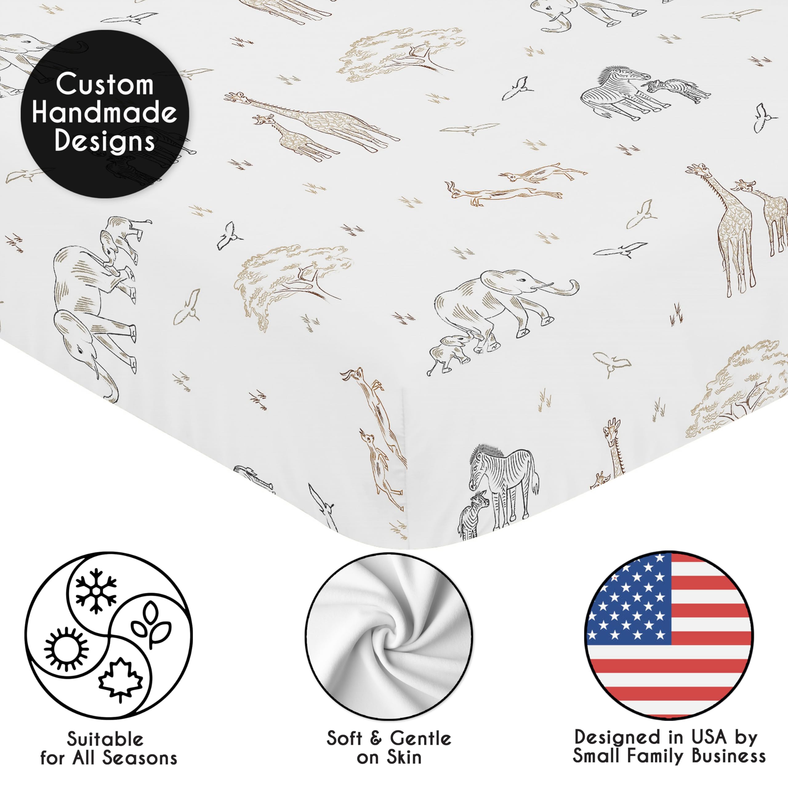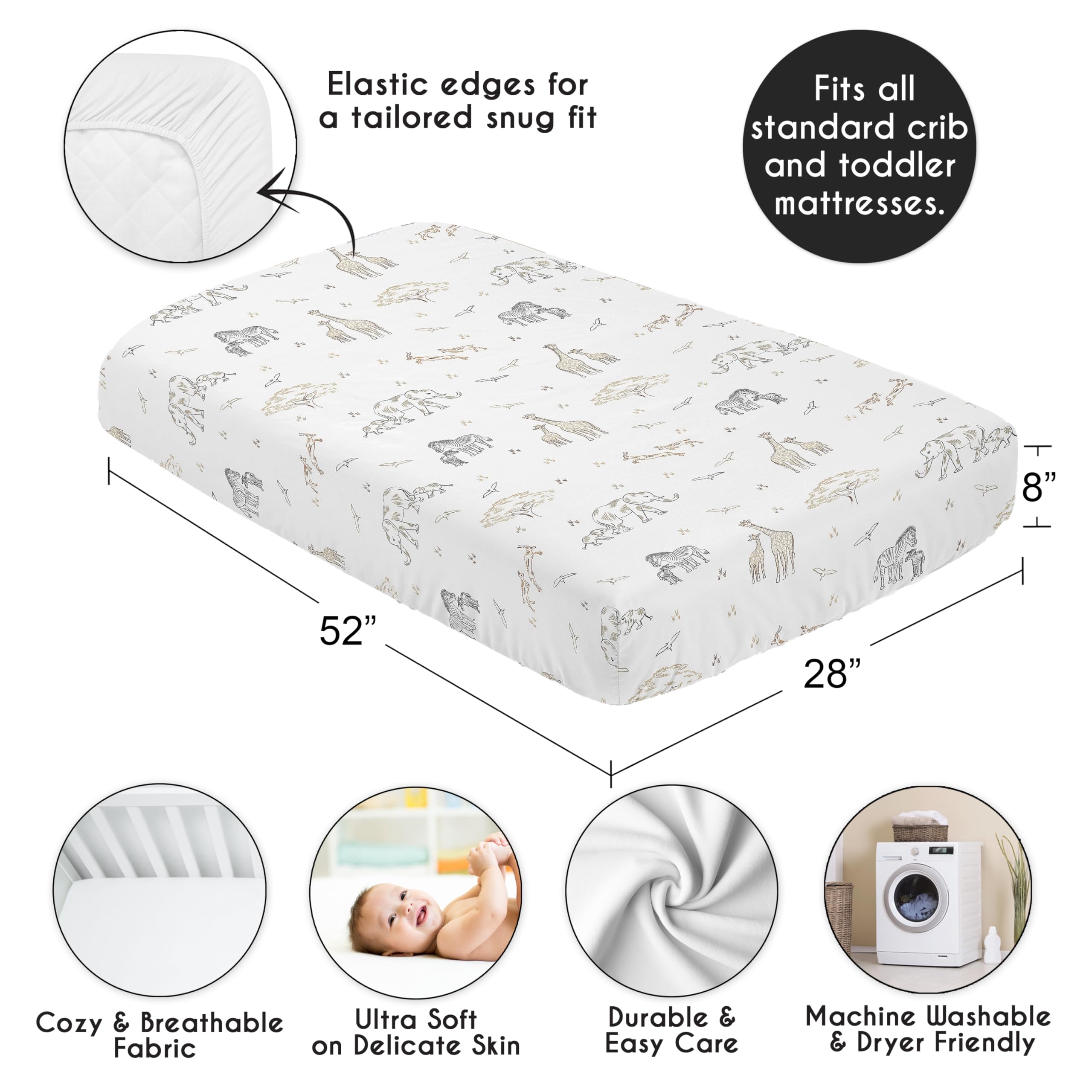SNUG FIT: Includes (1) Fitted Crib Sheet 52in. x 28in. x 8in. Our newborn standard crib sheets fit snugly, with premium elastic sewn around the entire bottom edge for a secure fit on most standard sized cribs and toddler beds, to reduce shifting and bunching. This brushed microfiber crib sheet features an exclusive design of neutral beige & taupe, jungle adventure safari animals, elephants, giraffe, serengeti animal print and is gentle on delicate skin to foster a soothing sleep environment.