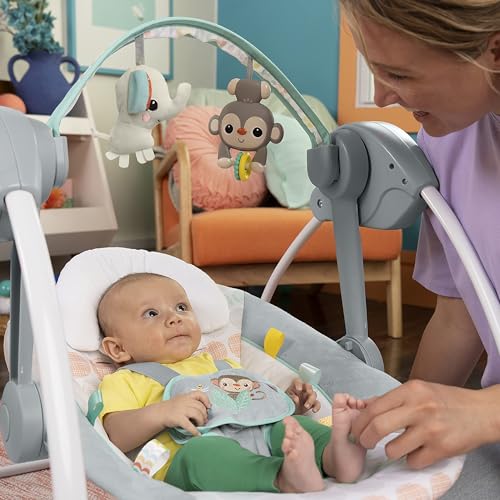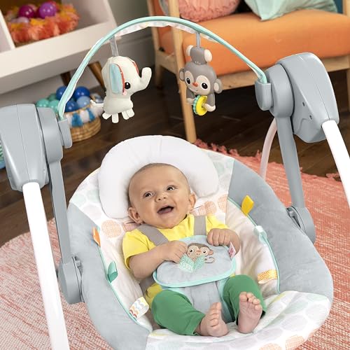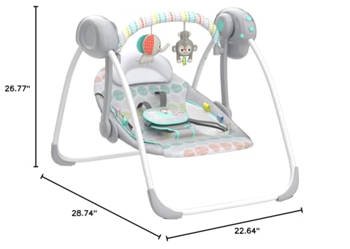 Swing, sway and rock-a-bye baby to more restful moments with the Bright Starts Whimsical Wild Portable Swing. With its 2-position recline, this swing #1 Manufacturer of Baby Entertainment* is sure to feel just right and makes a great baby shower gift. Donβt let its small size fool you β this swing is packed with features. TrueSpeed weight-sensing technology means newborns and infants will feel their same favorite speed, even as they grow. And with WhisperQuiet technology, the only sounds youβll hear are sweet sighs and babbles. Two smiling toys hang from the easy-to-remove toy bar while soothing Taggies hang along the side of the seat to keep baby in good swinging company. She can tug, rub and feel the silky sensory ribbons while she swings. With ten cheerful melodies, swing time is song time, and an adjustable five-point harness plus a removable head support pillow keep baby snug in the deep comfortable seat. Compact as it is cozy, the lightweight and foldable design makes it easy to pack up this mini baby swing. Easy care washable fabrics. Designed in the USA. (*Circana, Retail Tracking Service, U.S., Entertainment products, dollar sales, Jan-Nov 2023 combined)