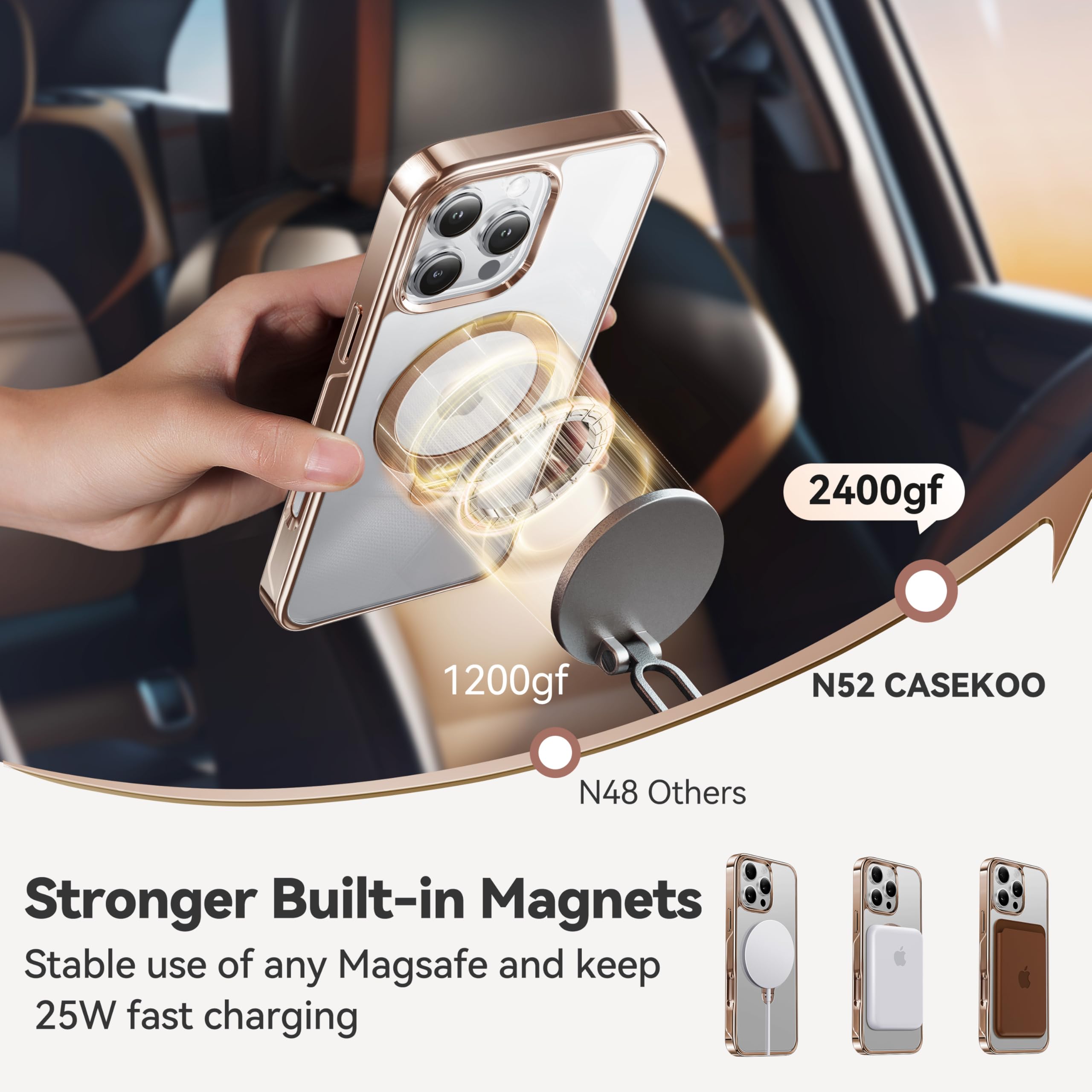 【Stronger Magnets Fit MagSafe】Embedded N52 magnets with MagPrime technology ensure 2x stronger magnetism and 25W fast wireless charging. Note: Not compatible with Tesla wireless chargers.