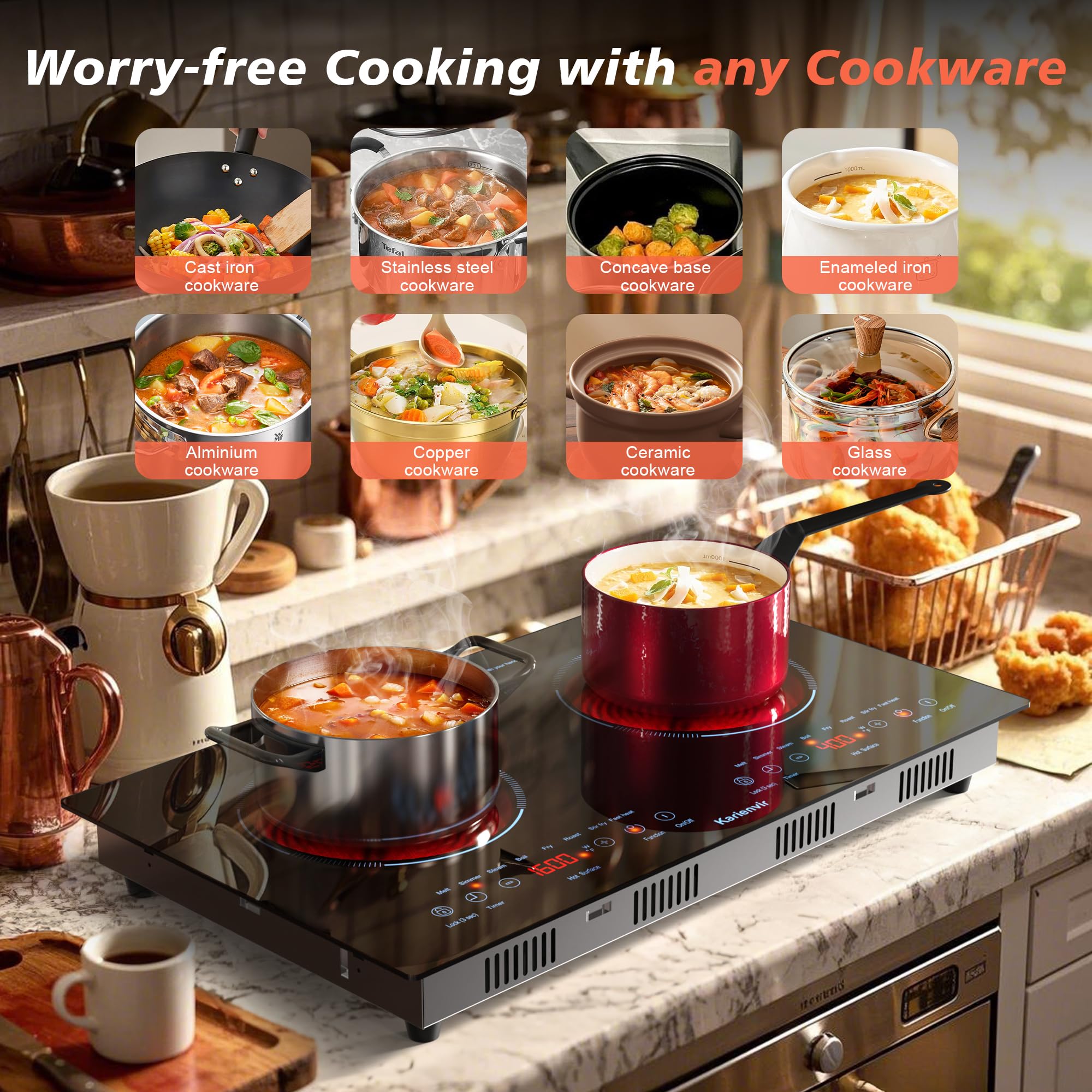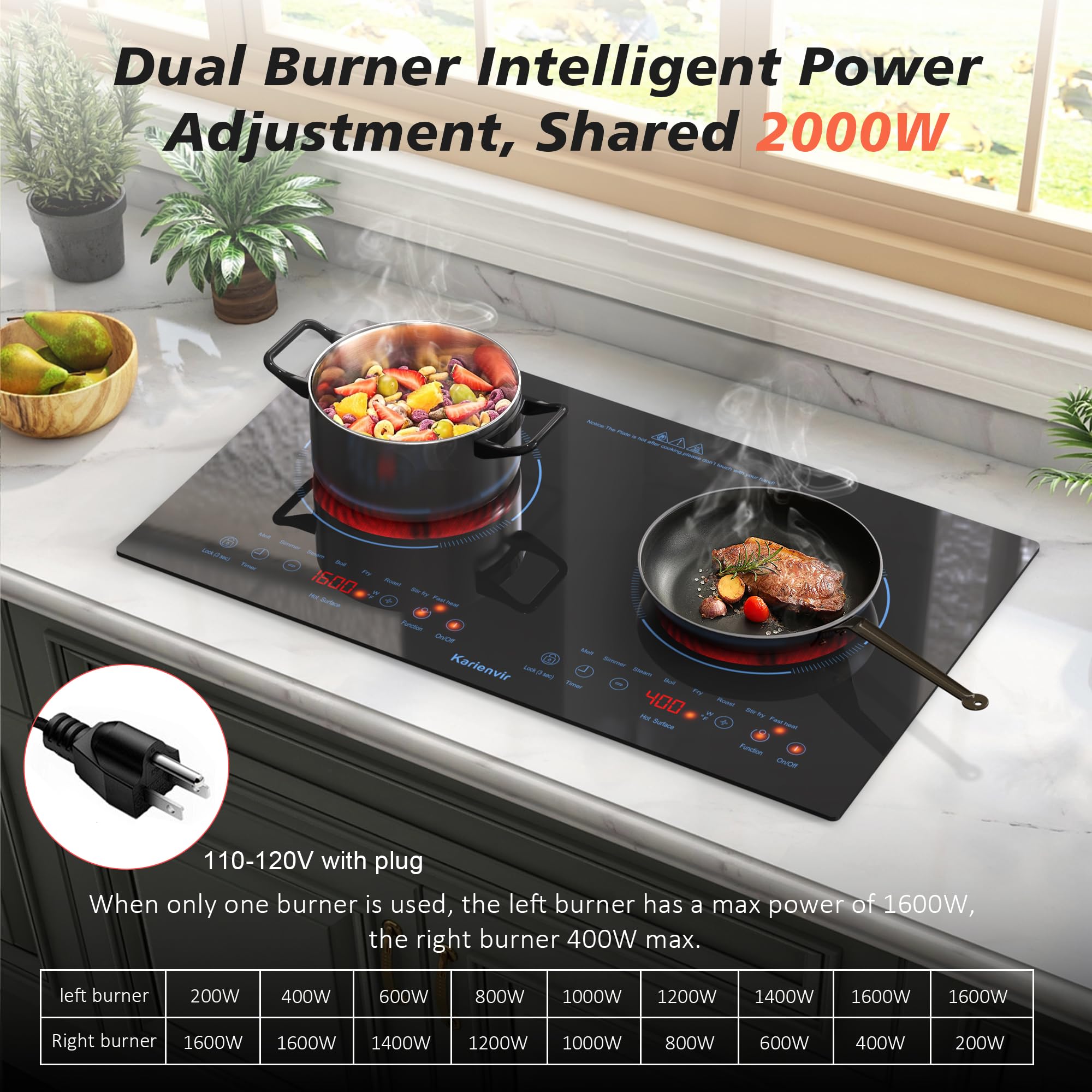 Safety Lock, Timer Double Protection : Karienvir portable electric cooktop 2 burners with built-in timer of up to 240 minutes. Precisely control the cooking time to avoid overcooking or burning food. Slow cooking food is easy to manage, no need to wait for long time in front of the electric stove. The electric cooktop comes with a safety lock design that locks all keys except the on/off button, which is a valuable feature for families with small children or pets, avoiding accidental touches and ensuring that the whole process is used.