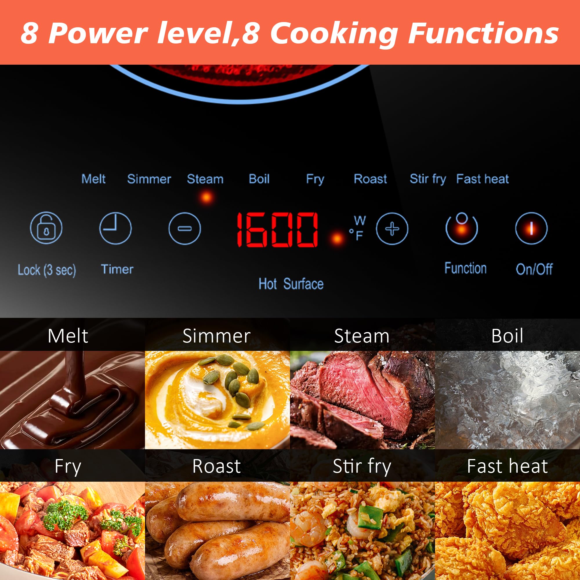 8 Cooking Functions : 110V Electric cooktop 2 burners provide 8 cooking functions to meet diversified cooking needs. After turning on the stove and selecting the cooking function by touch control, simply press "+" or "-" to adjust the power precisely. The operation is simple and convenient, and the cooking temperature can be controlled by your heart.110V kitchen electric stove has 8 cooking functions, which can be Melt, Simmer, Steam, Boil, Roast, Stir fry, and Fast heat, so that even novice cooks can easily cook various dishes.