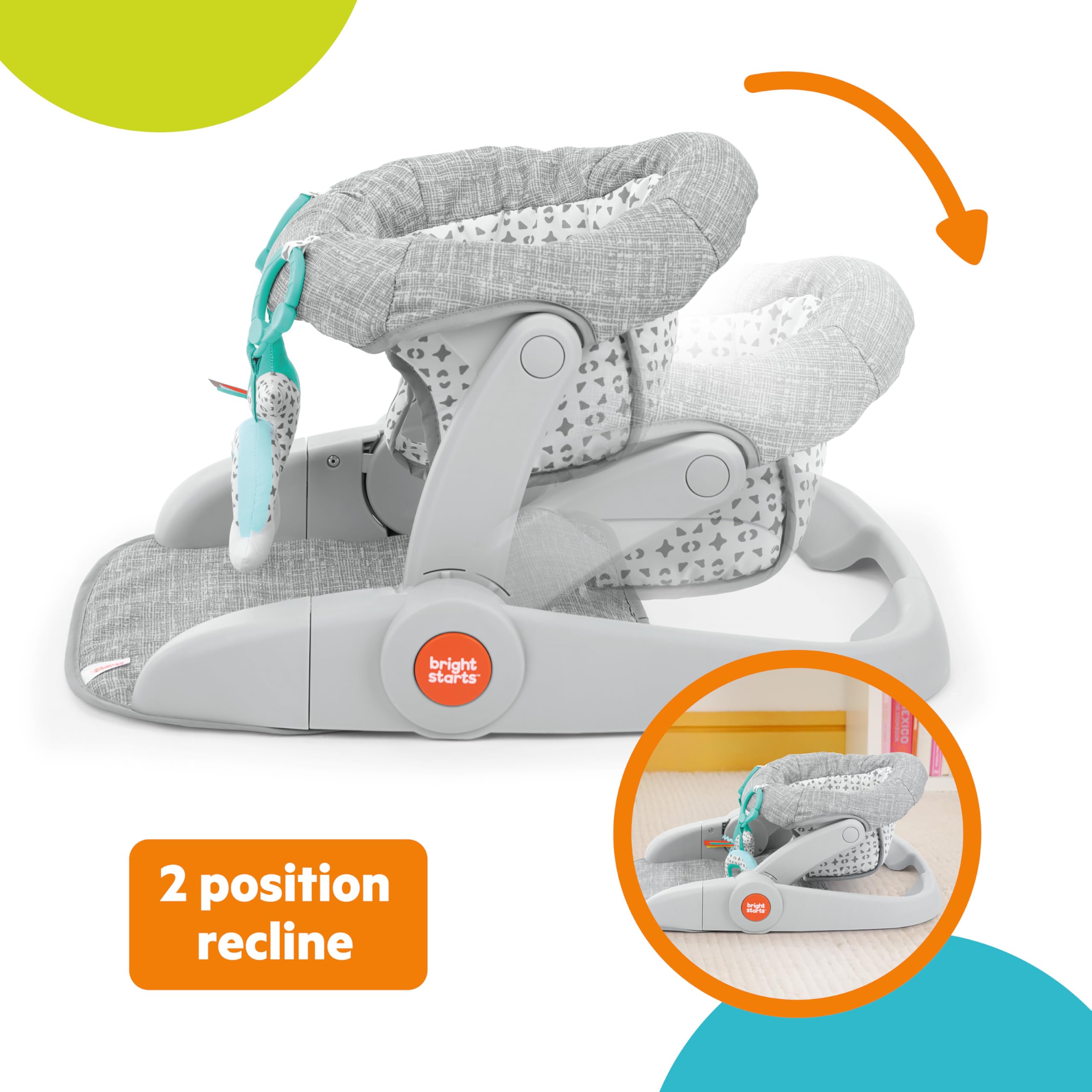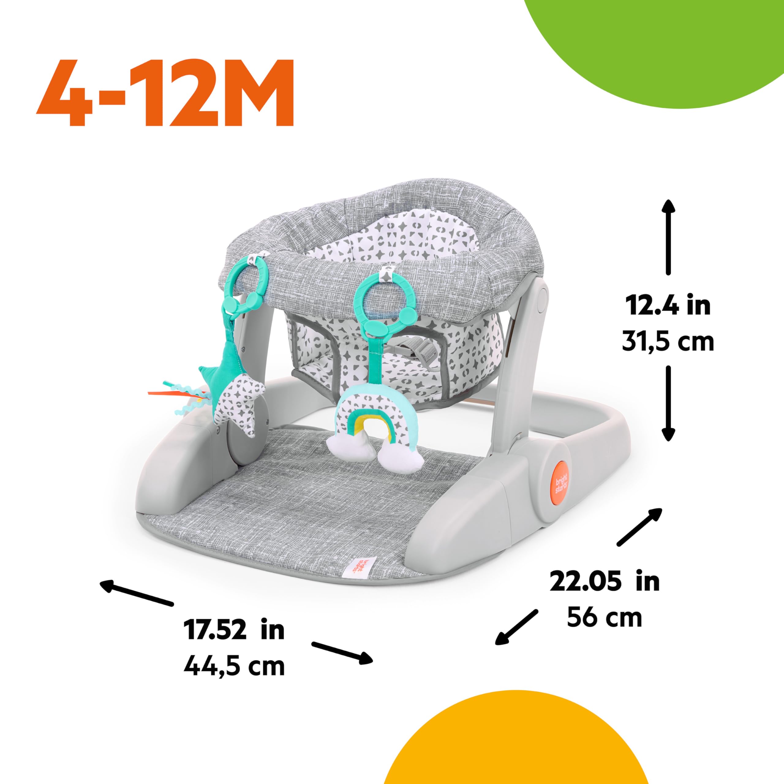 Give baby a front row seat to all the family action with the Learn-to-Sit 2-Position Floor Seat from Bright Starts! This baby seat bridges the gap from bouncer to booster seat as baby learns to sit up independently. In the lower position, younger babies can sit comfortably and safely when they can hold up their head independently (around 4 months old). Older babies can use the upright position to provide comfortable support as they learn to sit on their own. Designed for baby’s comfort, this floor seat features a padded seat and plenty of leg room. The high seat back offers additional support, helping prepare them to sit independently. The Learn-to-Sit also entertains baby while freeing up more hands-free time. Includes a soft rainbow toy and textured leaf toy, plus looped Taggies ribbons for entertainment and comfort. Easy to bring on the go as a travel baby seat – just fold flat for travel or storage! Seat pad is removable and machine washable. This grow-with-me floor seat is ideal for babies 4 – 12 months. Discontinue use when baby is able to climb or walk.