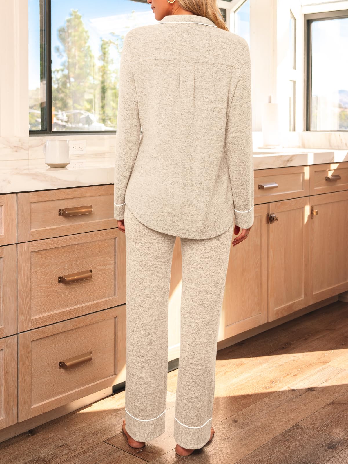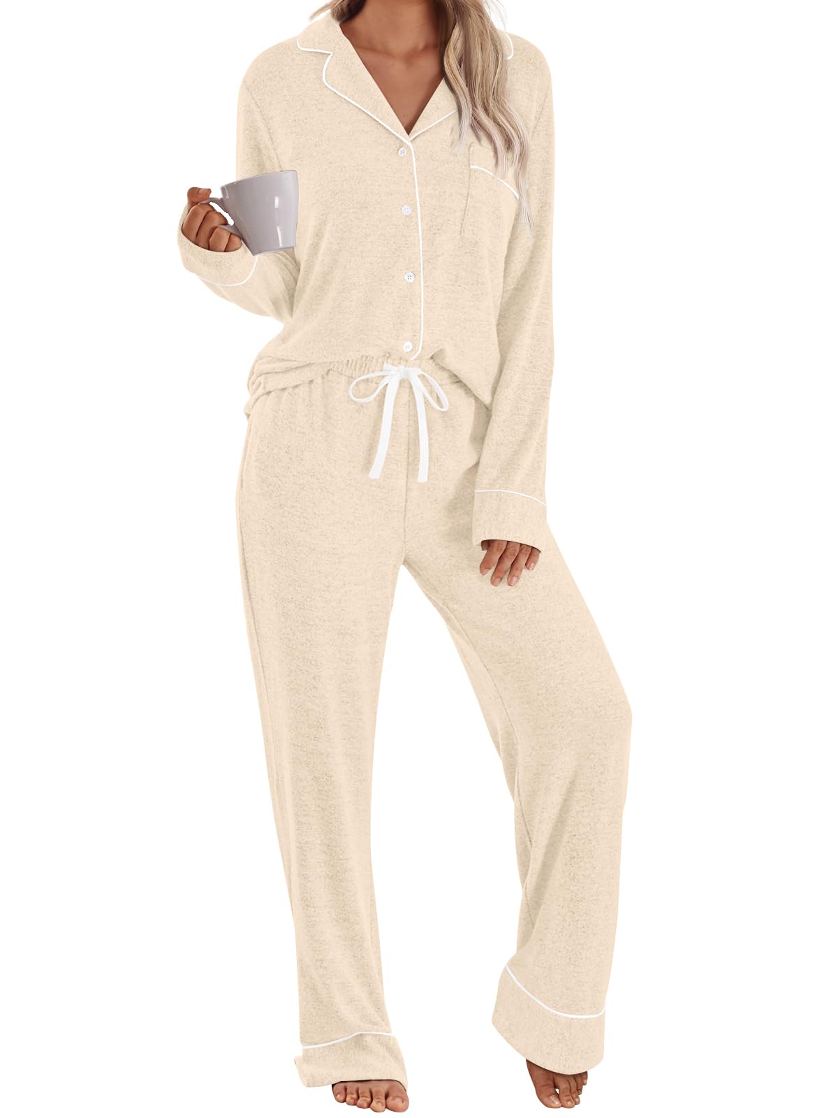 Fashion Design: Womens casual long sleeve v neck button down pajamas sets, pants with drawstring elastic design