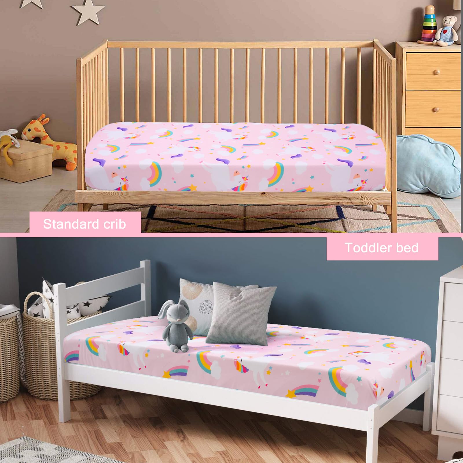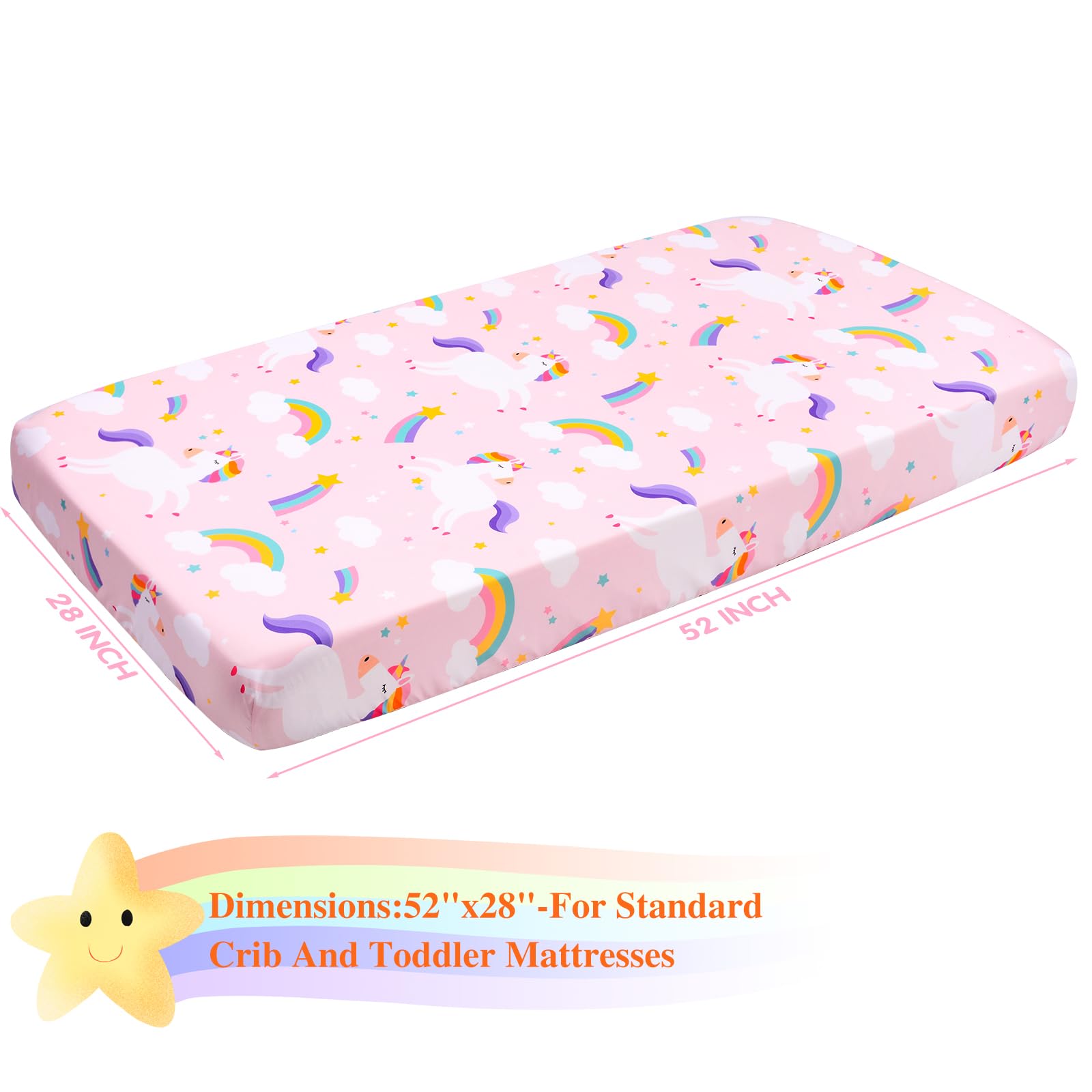 【Universal Fit】:The pink unicorn fitted crib sheet dimension 28 x 52 inches,and height of 3”to 8”for standard crib and toddler mattresses.Fits all standard Crib Mattresses and Toddler Bed Mattresses.