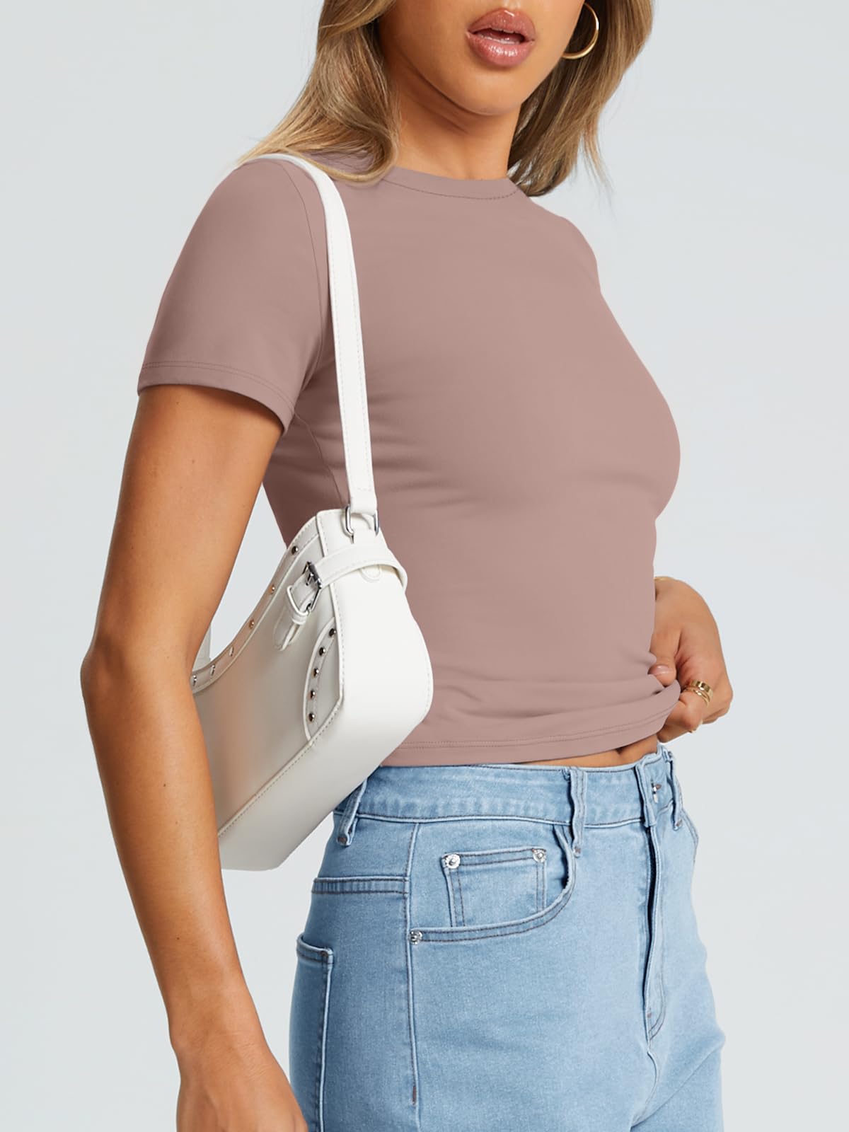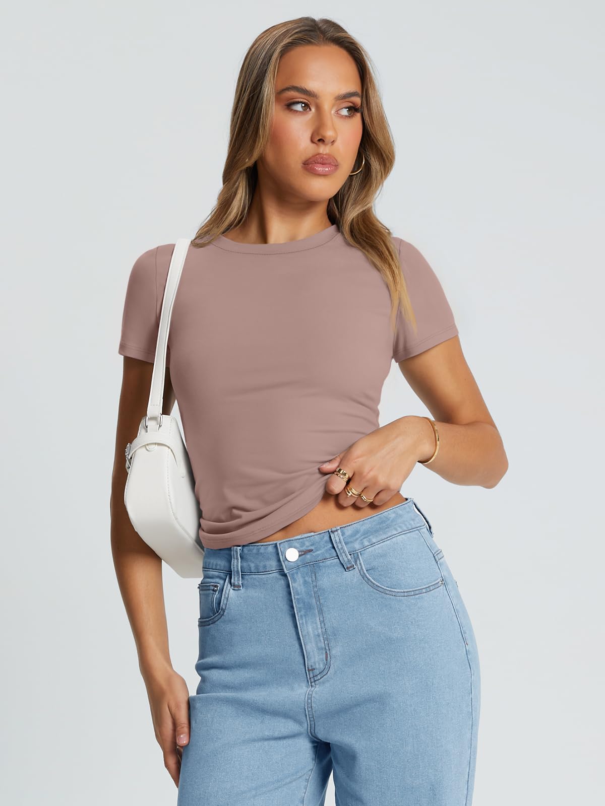 Design: This top features a cute, slim-fitted, and casual style with a crew neck and short sleeves. It comes in both cropped and regular styles, giving you the option to wear it as a regular top or fold it up for a trendy crop top look