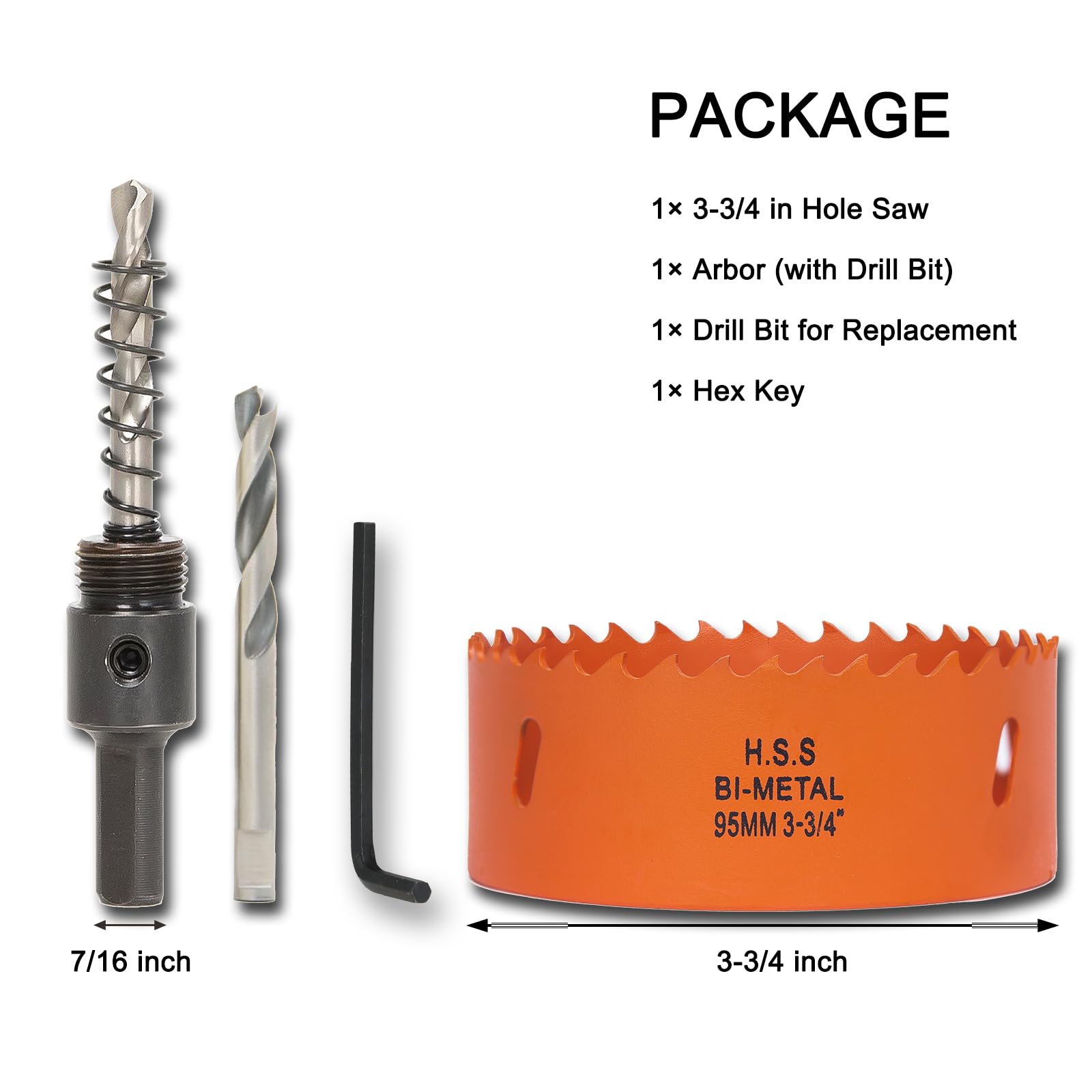 Package Included: 1 pc 3-3/4 inch hole saw, 1 pc arbor(with 1 drill bit), 1 pc replacement drill bit, 1 pc hex key