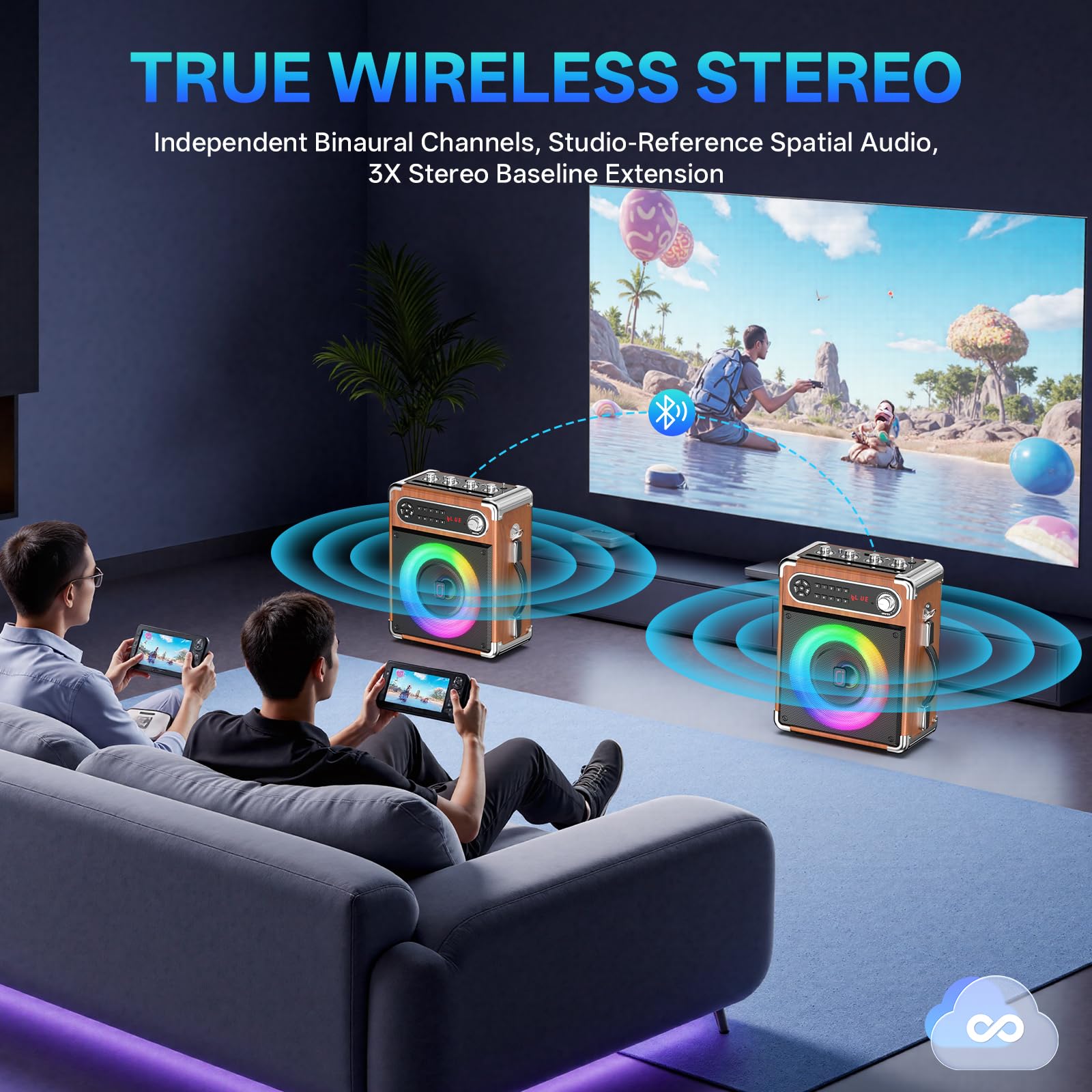 True Wireless Stereo (TWS) soundstage — Pair two units for real left/right channel separation and a wider, more cinematic sound field—perfect for living rooms, backyard BBQs, and outdoor movie nights.