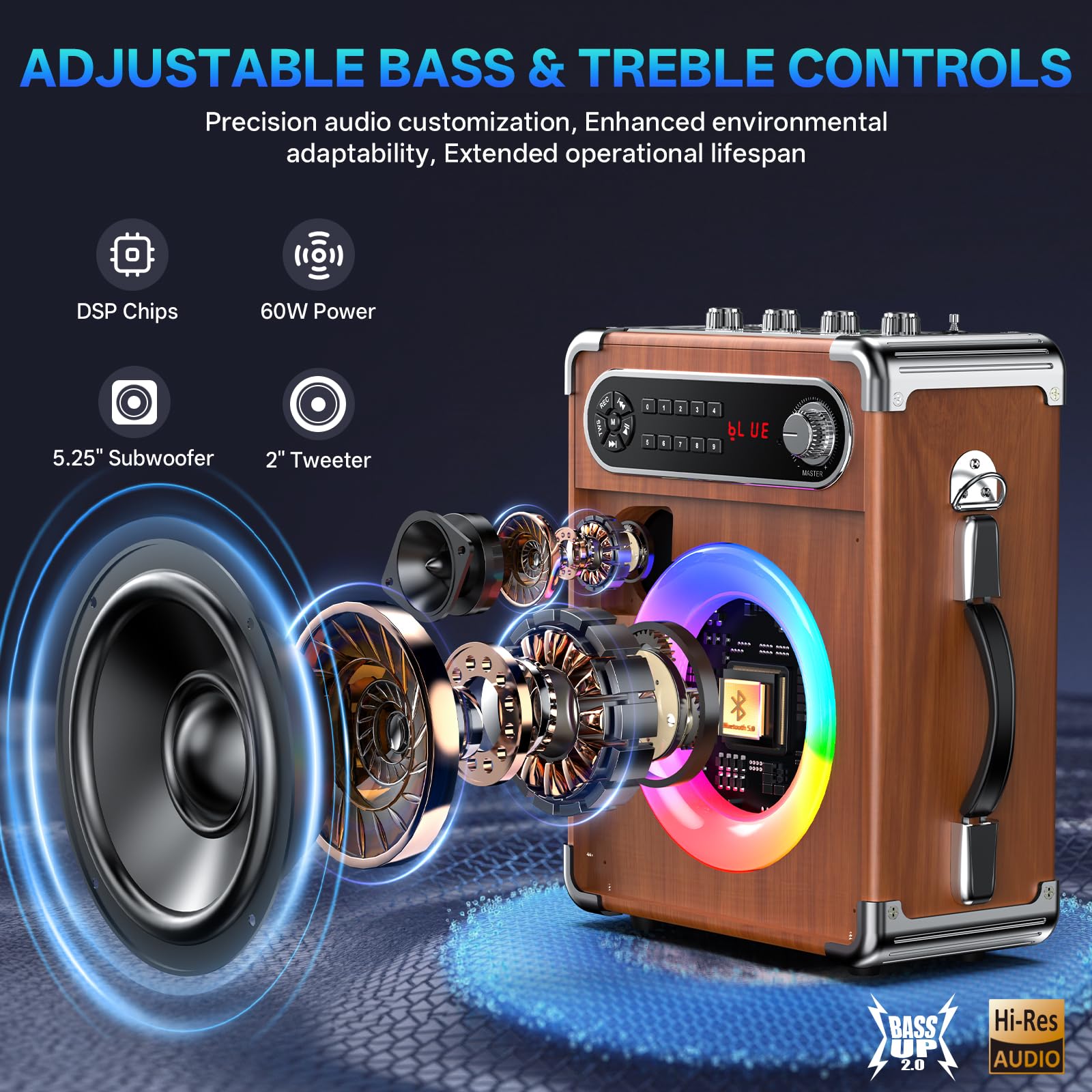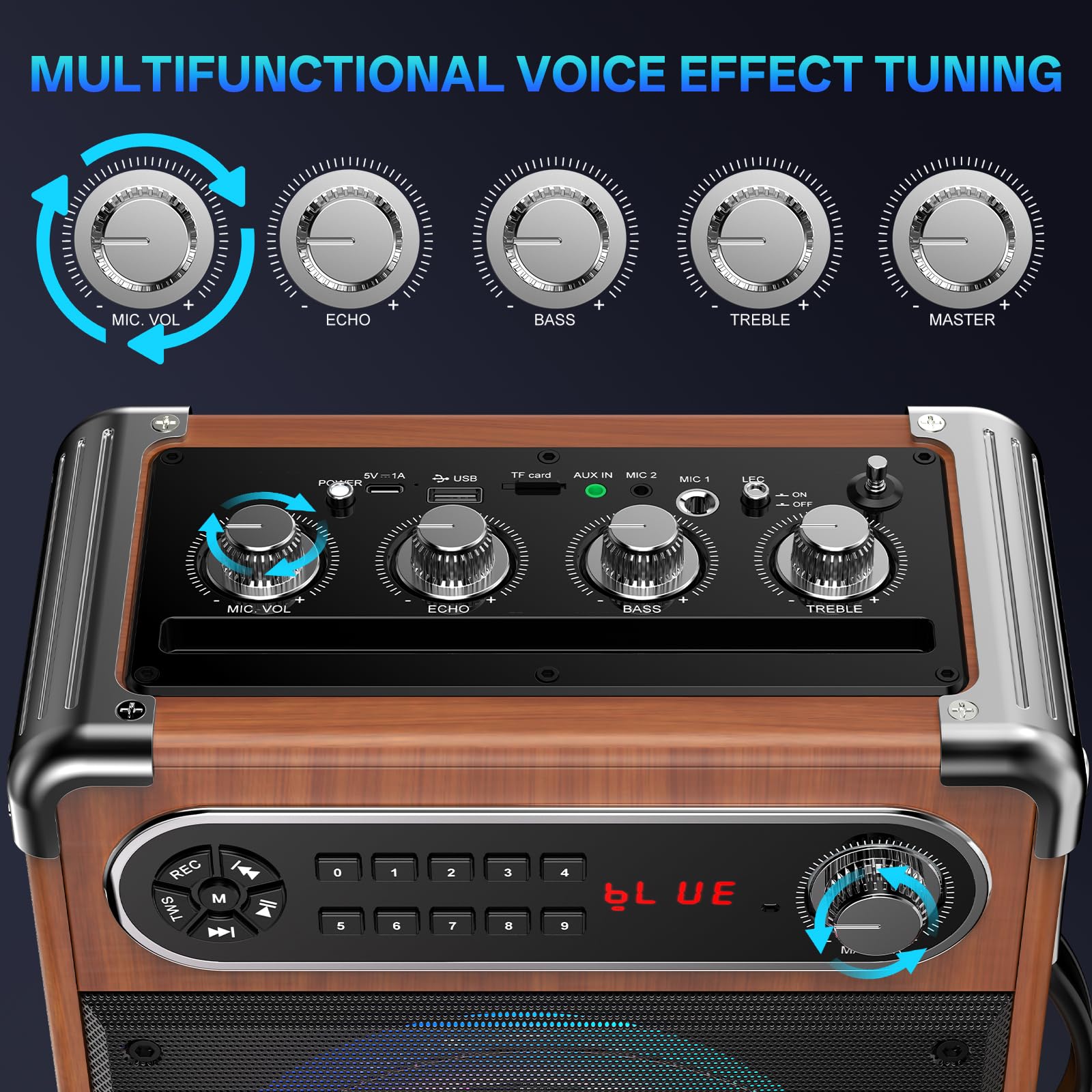 Dual wireless mics with stage-style vocal control — Two wireless microphones pair in seconds and capture voices with clarity for solos and duets. Dial in mic echo from subtle “room” to big “hall,” and shape your mix with independent Bass/Treble knobs—no mixer or apps required.