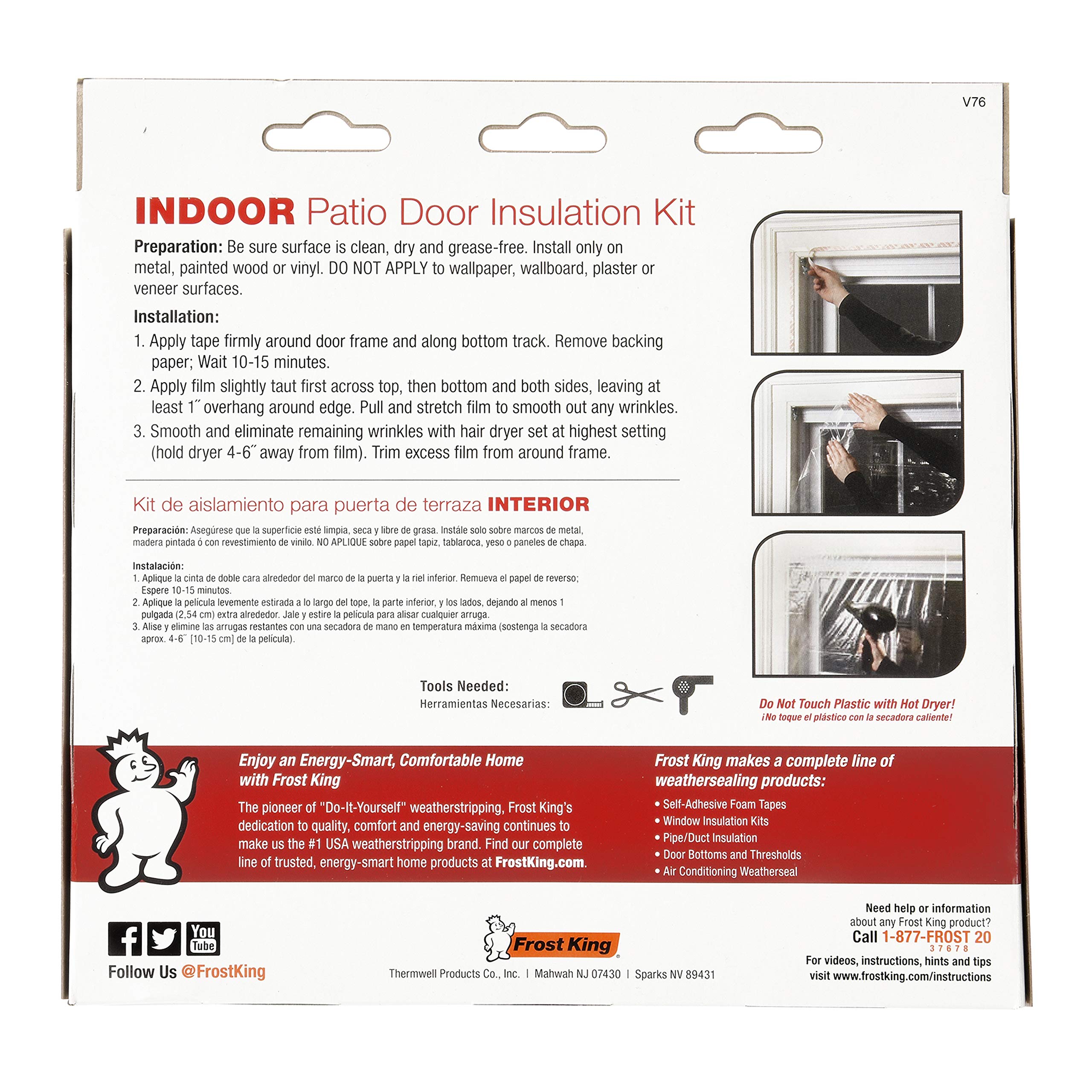 Product Description Frost King V76H Indoor Shrink Window Kit 84-Inch by 110-Inch, 1-sheet, Clear From the Manufacturer Frost King Shrink Window Kits are made for patio doors or large size windows and feature a crystal clear plastic sheet that shrinks tight and wrinkle free with any ordinary hand held hairdryer. Easily installs on metal, painted or varnished wood or vinyl clad frames with the double-face tape provided.. Manufacturer Contact Information 1-800-526-5265
