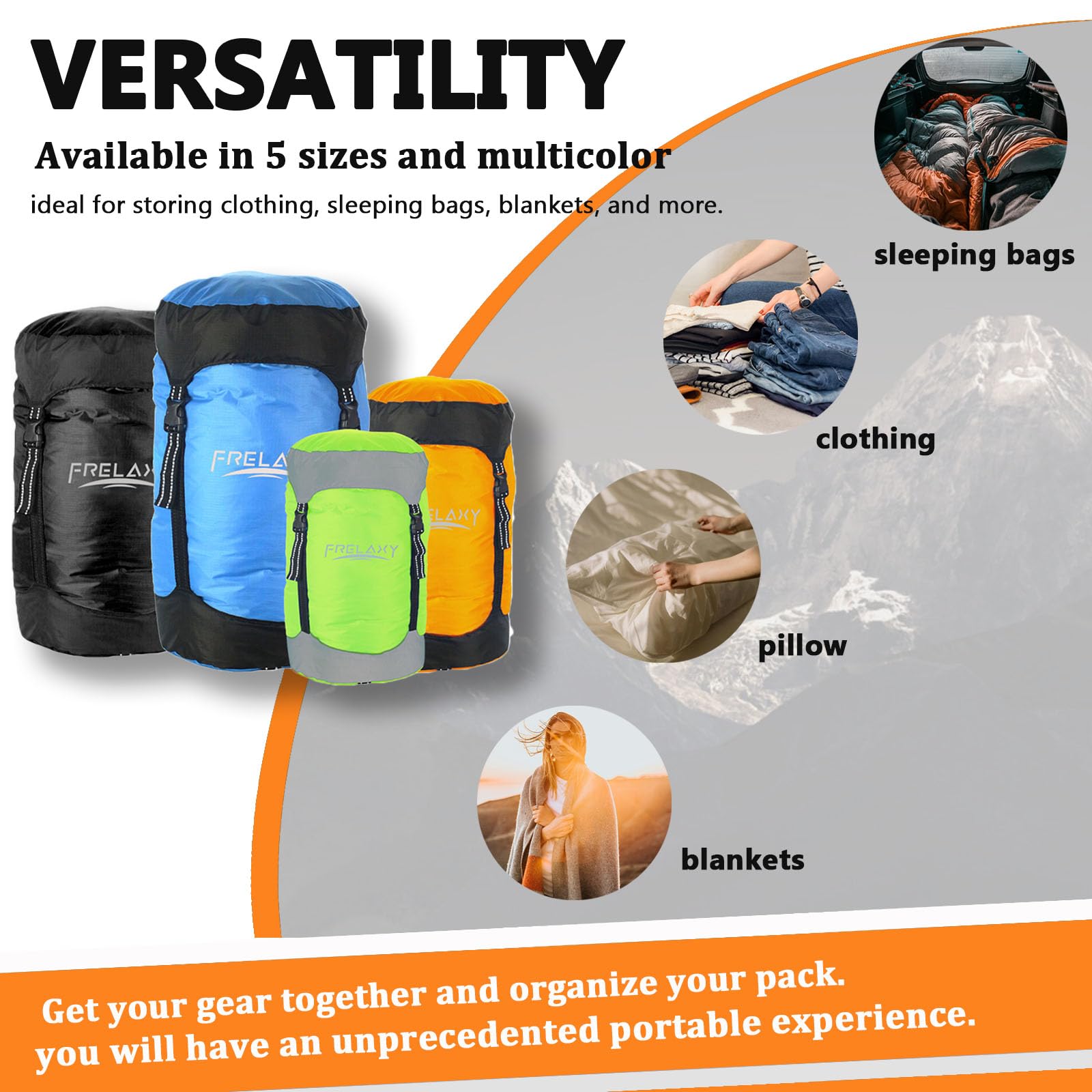 SAVE 40% MORE SPACE: Frelaxy Compression Stuff Sack is an incredibly simple and practical solution to space-saving, they will give you more space to pack what you need and give you an unprecedented portable experience.