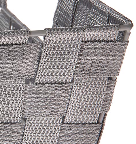DURABLE: The tote is made of thick woven polypropylene fabric strapping. It is wrapped around a durable steel epoxy coated frame to hold its shape. It is easy to wipe clean and is sure to last.