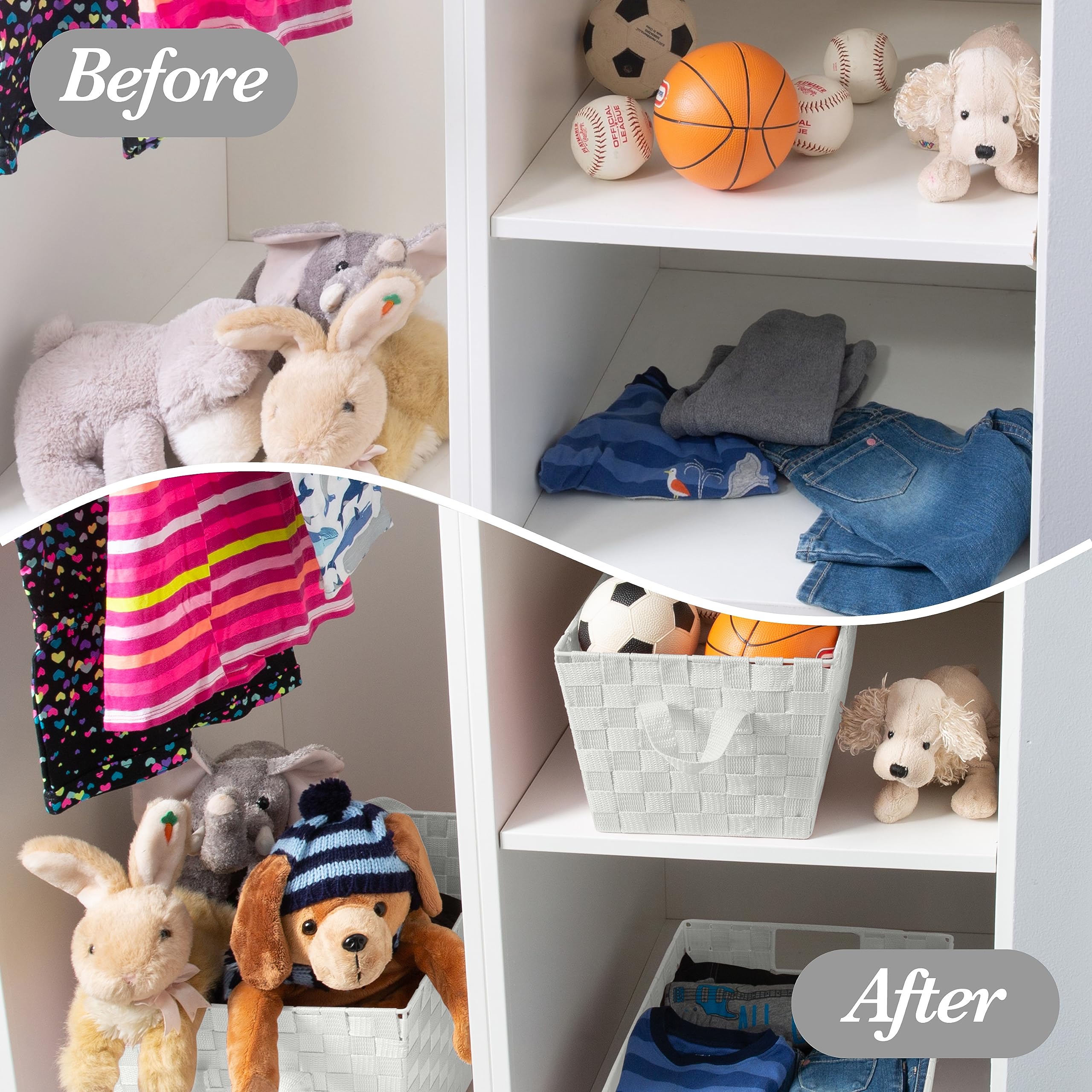 HANDLES: The storage basket has 2 wire integrated open handles. This makes it easy to pull it off the shelf and carry it around.