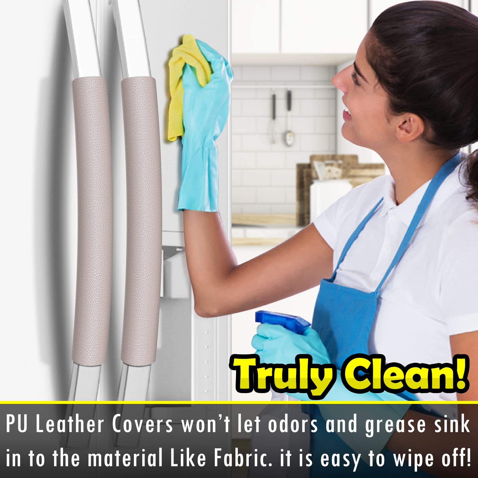 【Keep Truly Clean】Synthetic leather is the perfect material for handle covers! Kitchen handle covers see lots of dirty hands that can leave all kinds of stuff on them after you open and close your appliances. Our leather handle covers are non-absorbent and easily cleaned when they get dirty.