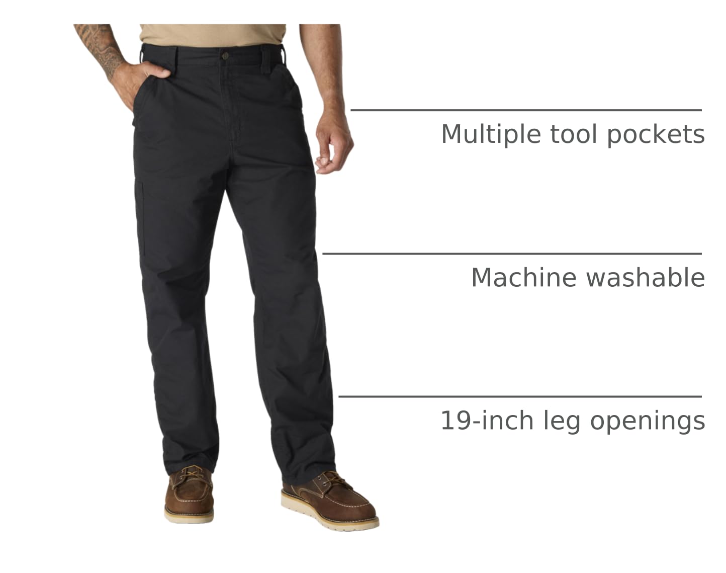 Description Comfortable, practical and long wearing, carhartt's washed duck work dungaree is made of premium 12-ounce, 100-percent ring-spun cotton duck, there's a full seat and thigh, plus a fit that sits at the natural waist, the dungaree is outfitted with multiple tool and utility pockets plus a hammer loop, the back pockets are reinforced, and, the 19-inch leg openings fit over work boots