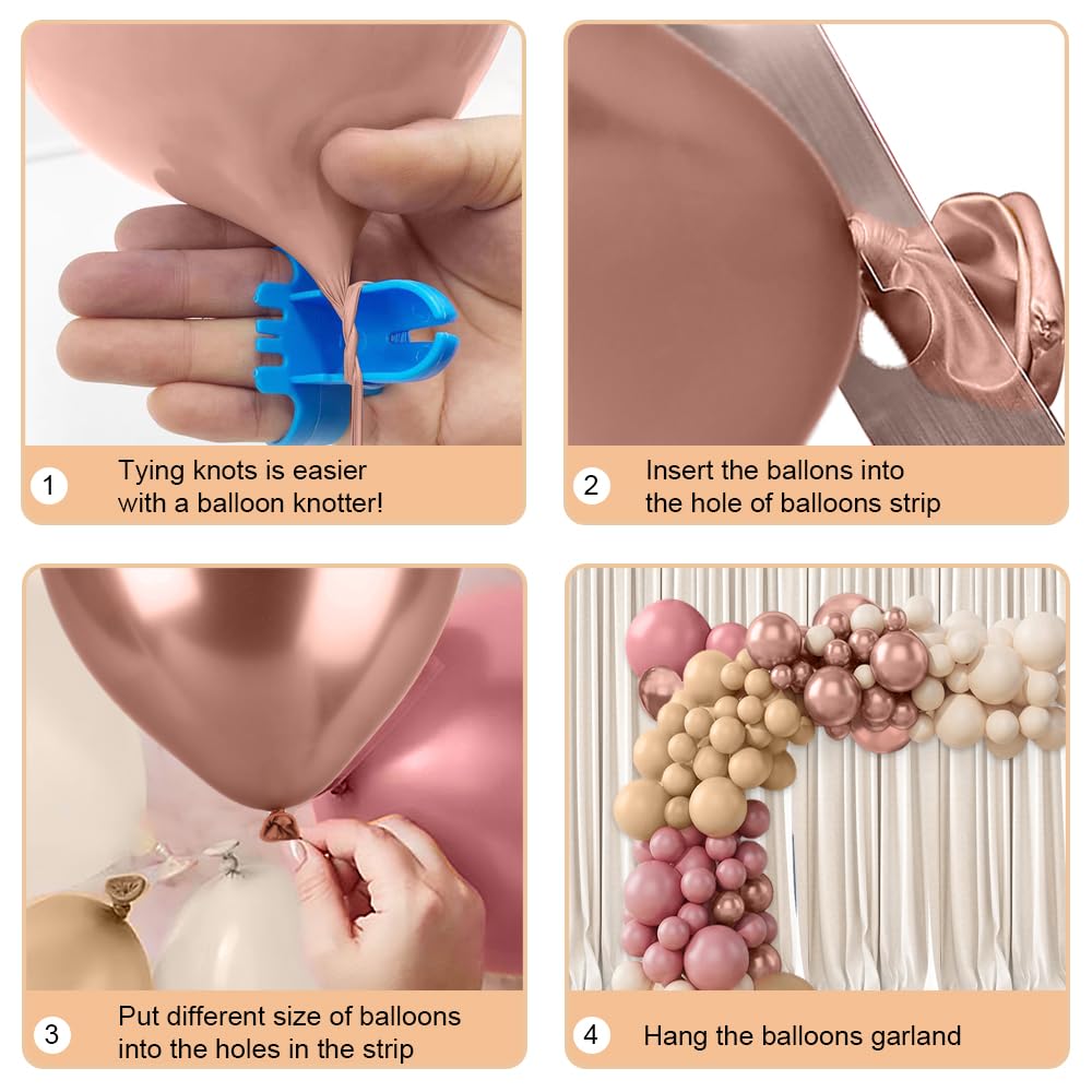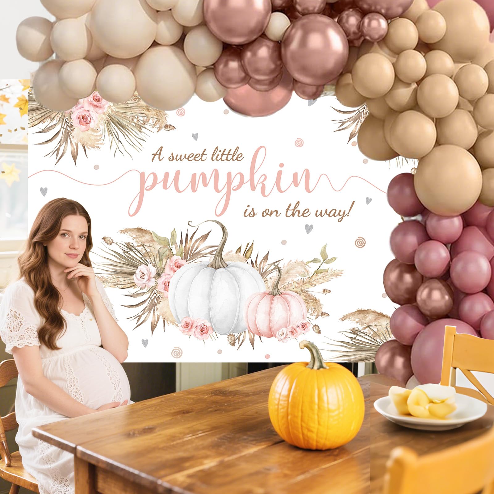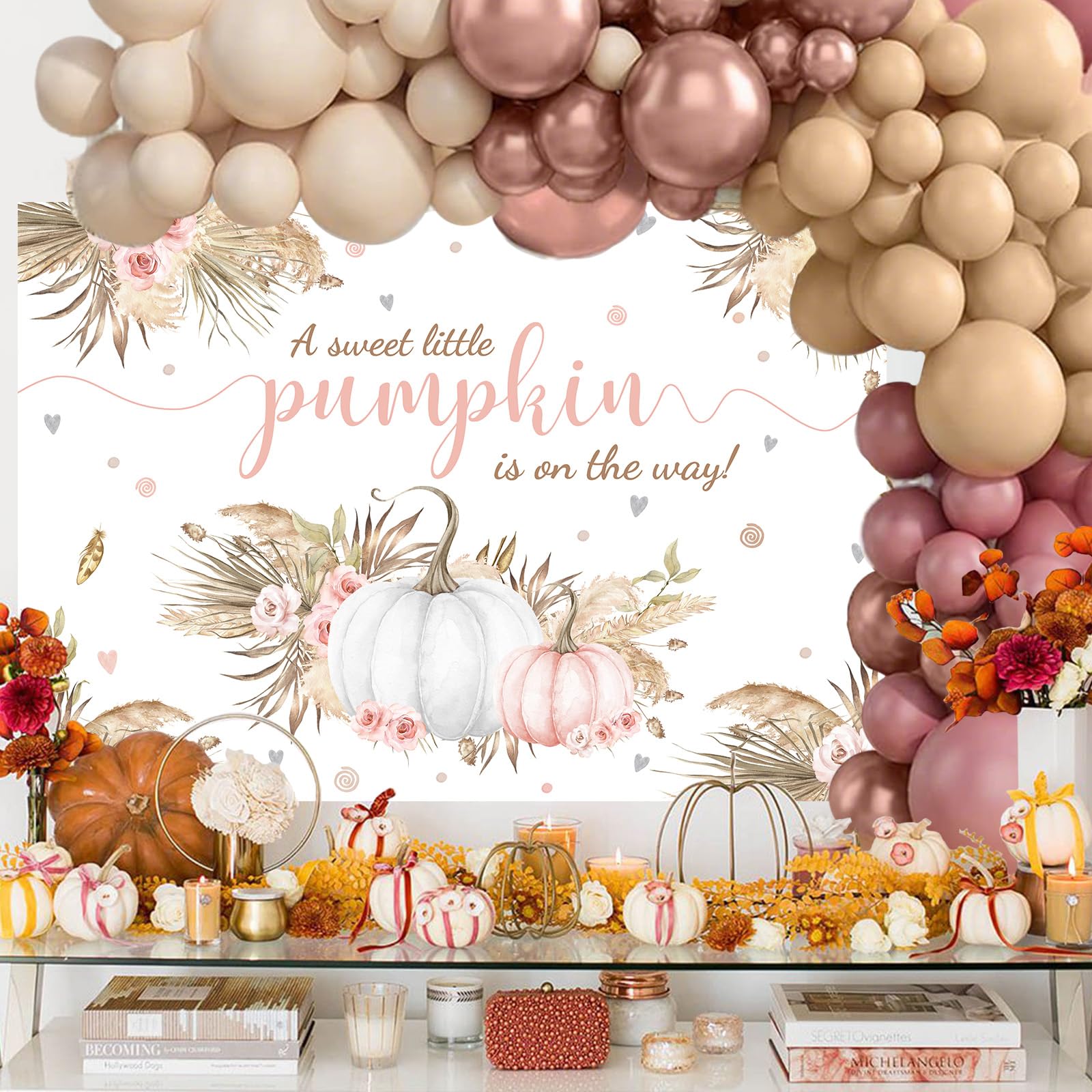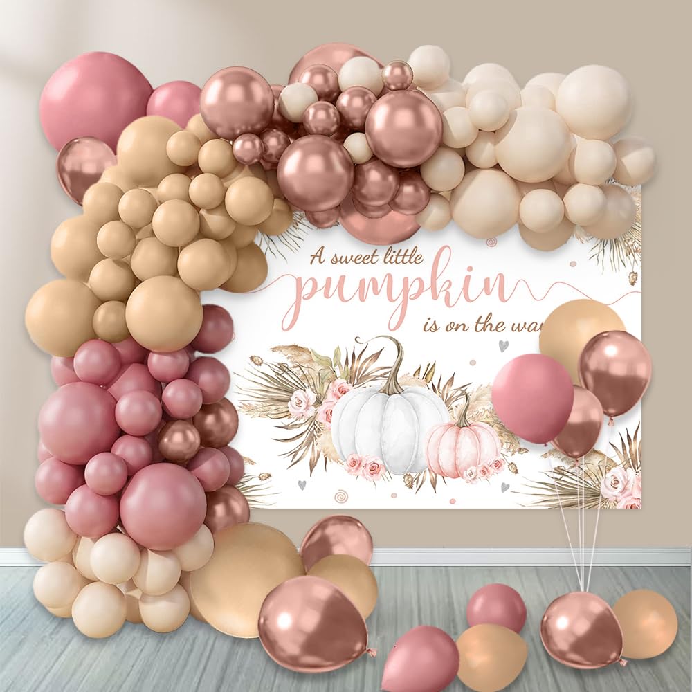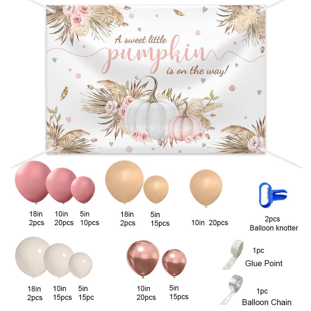 Boho Pumpkin Baby Shower Balloon Garland Arch Kit: Package suit includes 2 vintage pink 18-inch balloons, 20 10-inch balloons, and 10 5-inch balloons. There are also 2 flesh-colored 18-inch balloons, 20 10-inch balloons (flesh-colored suit with new gray), and 15 5-inch balloons. Additionally, there are 2 sand white 18-inch balloons, 15 10-inch balloons, and 15 5-inch balloons. There are 20 metallic rose gold 10-inch balloons and 15 5-inch balloons. In addition, there is adhesive, a 5-meter balloon ribbon, and two balloon tying tools.