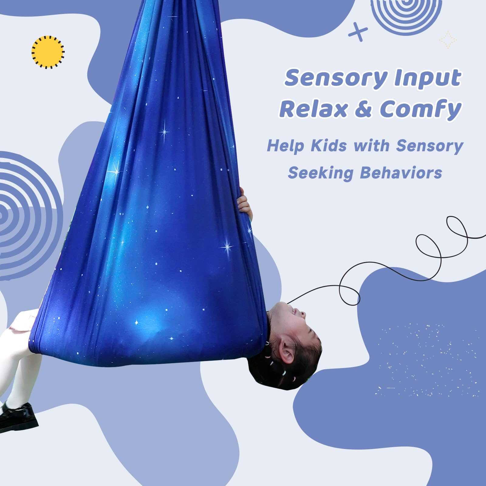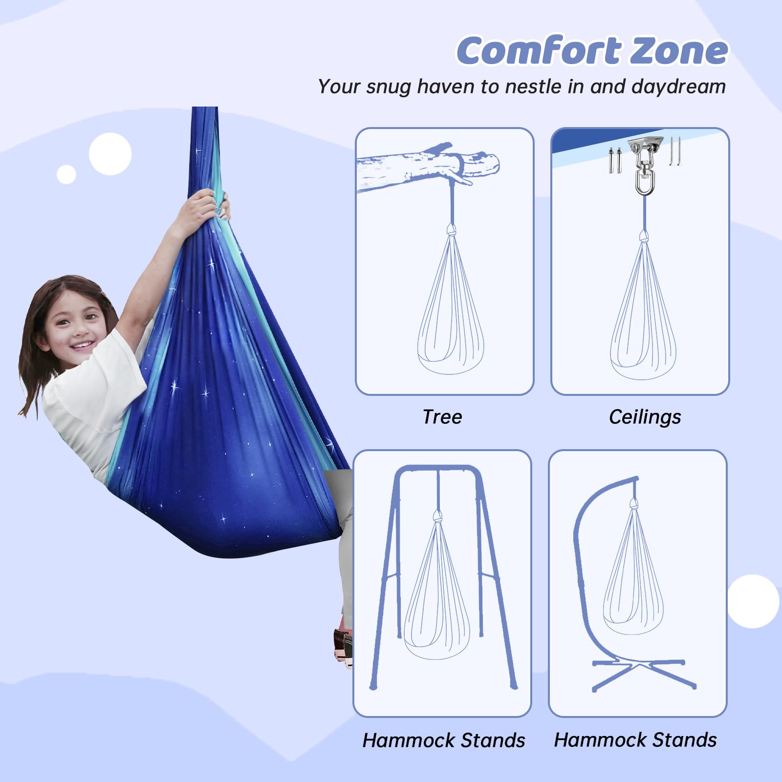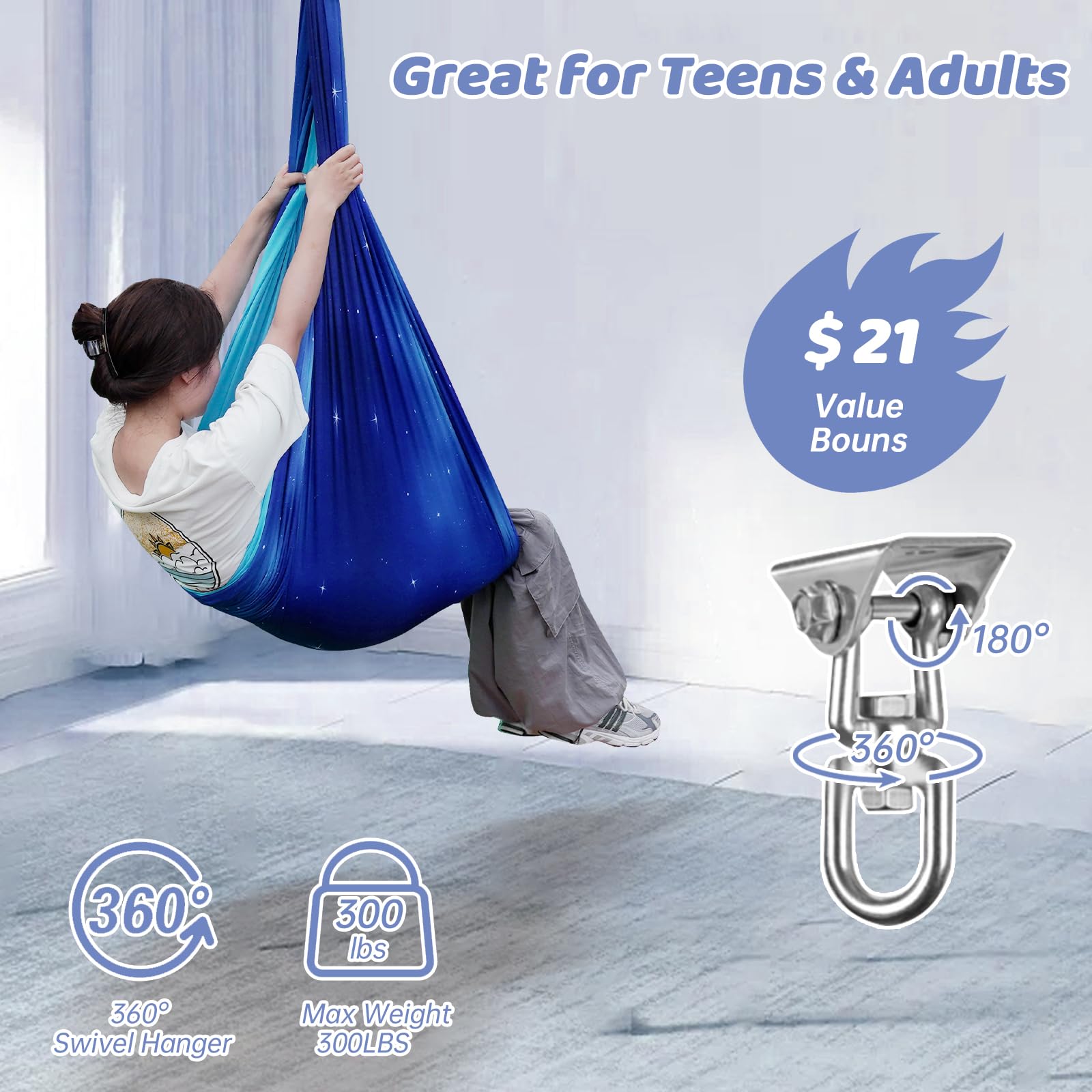 [FOR SPECIAL NEEDS]: Ideal of this cuddle swing is designed for kids and teens who have Sensory Processing Disorder, Asperger's Syndrome, ADHD, or those on the autism spectrum. The sensory therapy swing helps child learn body awareness, balance, motor planning, and spatial skills. It also provides sensory pressure all over and creates a fun space to bounce, swing, spin, or lie down enjoying the movement of the swing.
