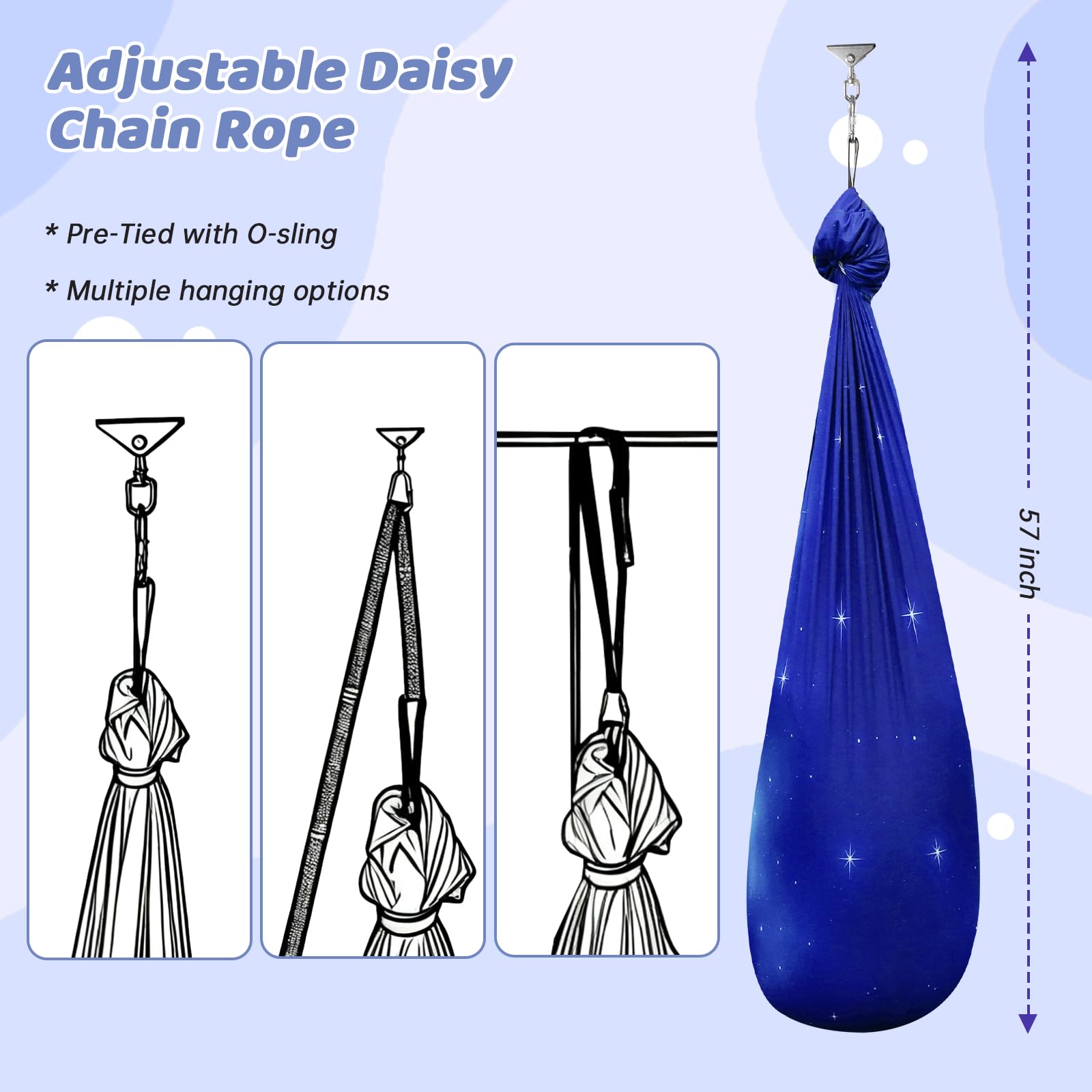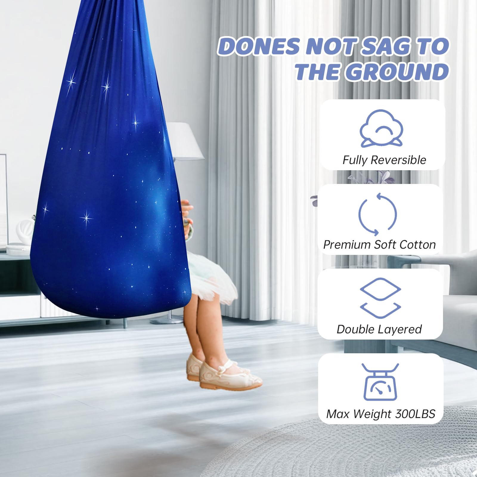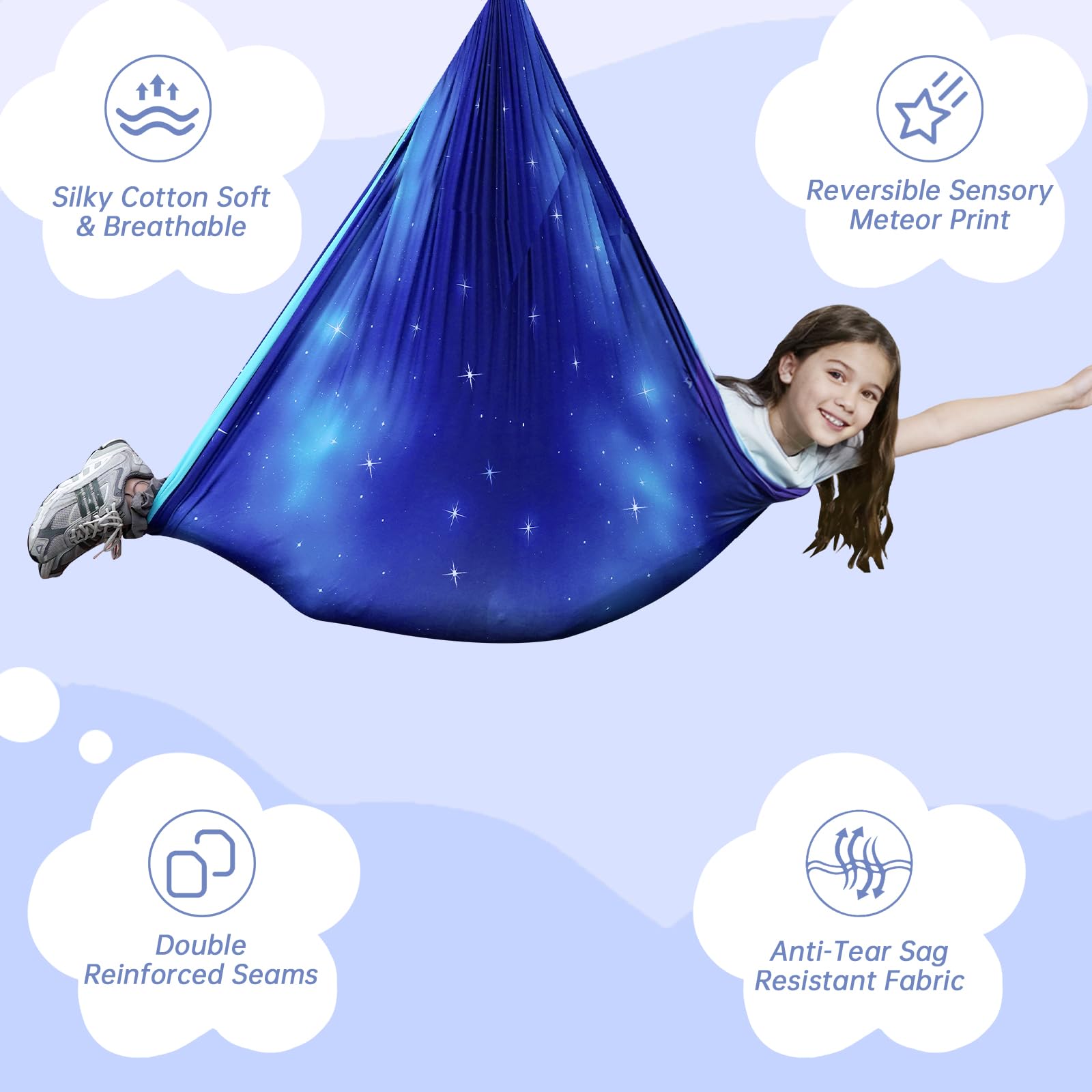 [SOFT SILKY MATERIAL] This therapy sensory swing is made of comfortable material--soft & silk Cotton&Polyester. It measures 59"L x 67W". Kids can sit and cocoon comfortably in the hammock with a sense of calmness. Our updated hammock can block out unwanted sensory stimulation.