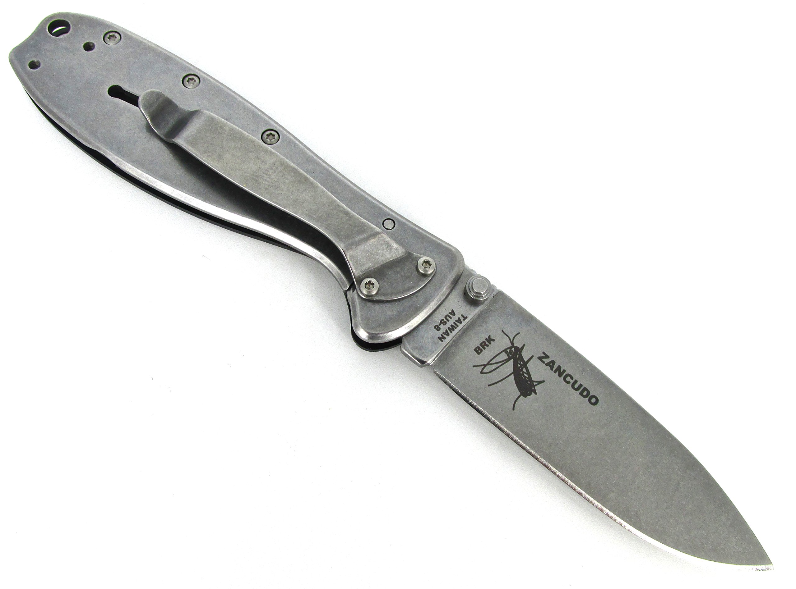 Designed by ESEE Knives Randall's Adventure and Training School of Survival. The word Zancudo is Spanish for Mosquito. The Zancudo is a 4" frame lock tactical folder. Model R1 features a 3" AUS-8A stainless blade with a Stonewash finish. Black G-10 front handle with a Stonewash stainless back. Includes a lanyard hole and Stonewash stainless pocket clip. These Zancudo folders are not manufactured by ESEE, nor do they carry the ESEE logo. The round Randall's Adventure & Training logo was licensed to Blue Ridge for use on these knives. This folder is designed and fully endorsed by Mike Perrin and Jeff Randall. ESEE does not warranty, market or sell these folders. For warranty information contact Blue Ridge Knives.