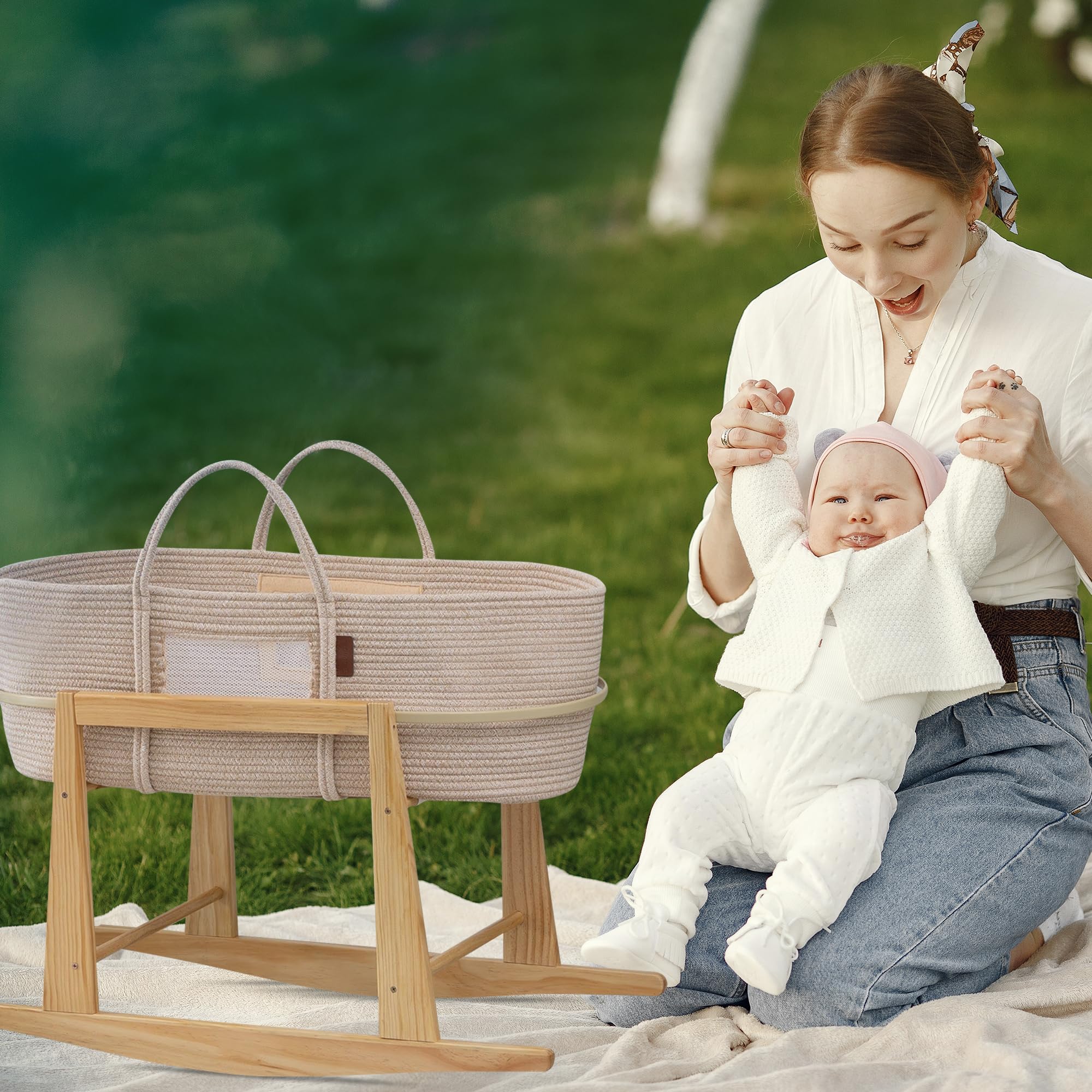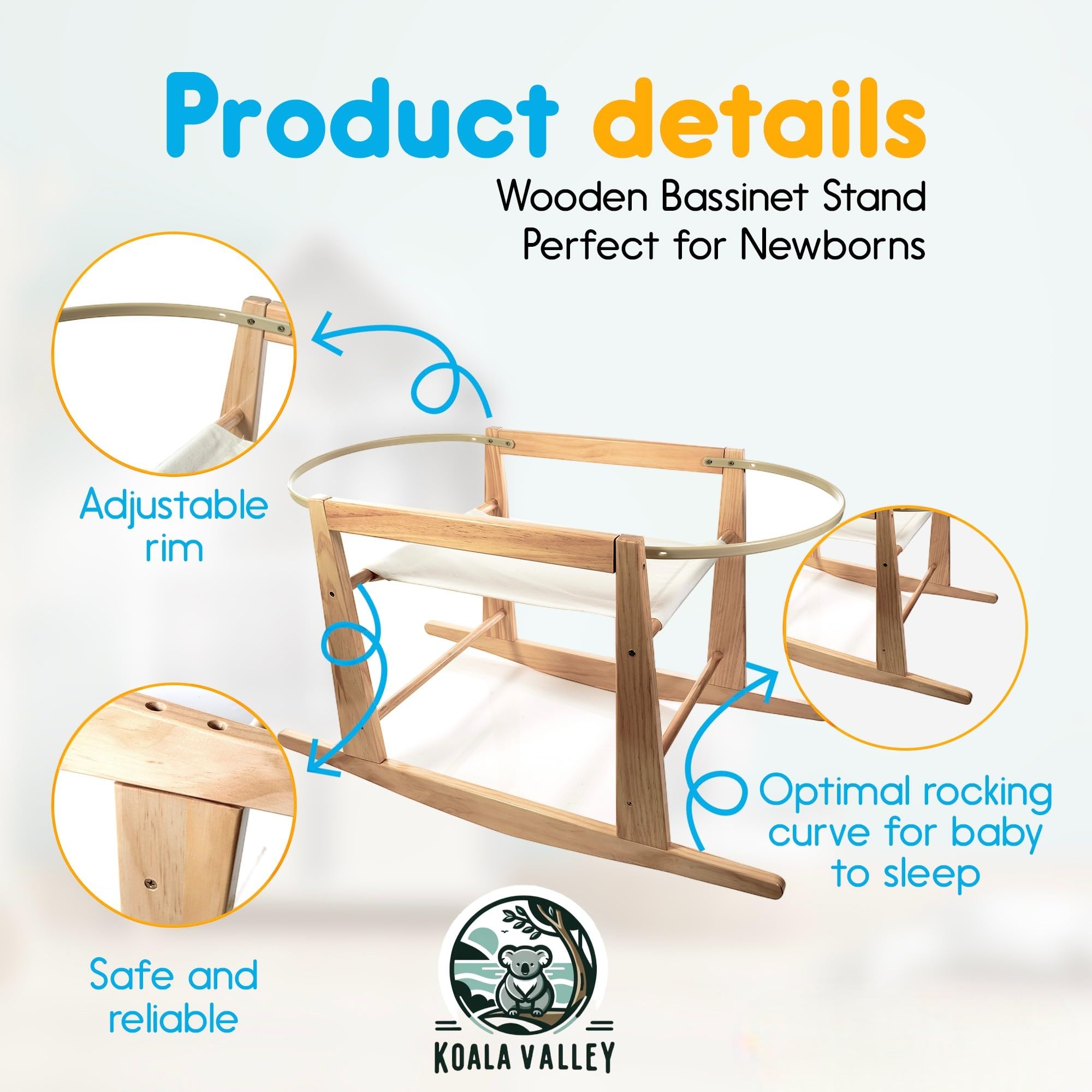 Wooden Bassinet Stand - The stand is made of strong and durable wood, ensuring it can support the weight of your baby safely. It's adjustable feet allow for stationary or rocker use, giving you flexibility based on your baby's needs.