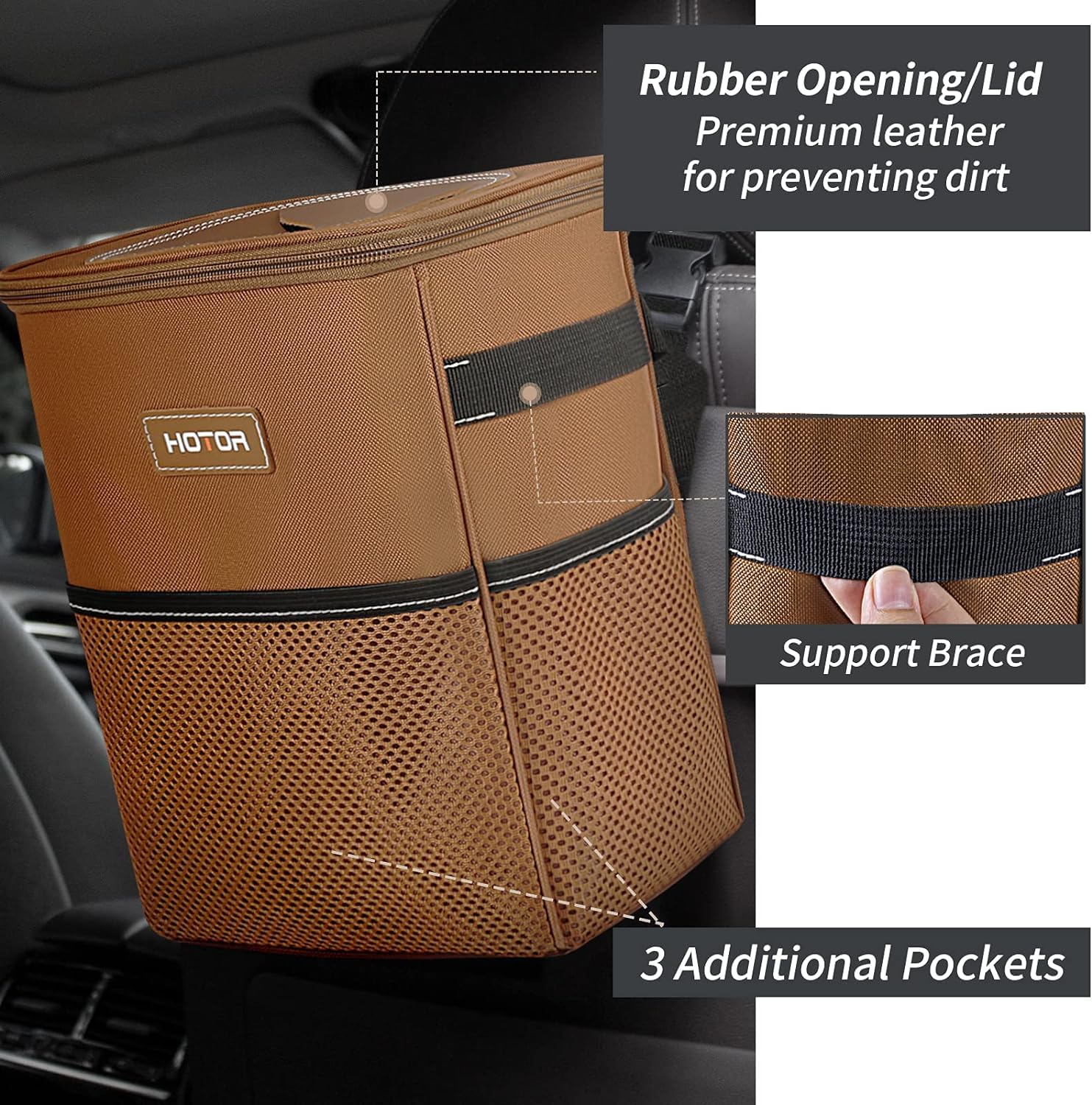MULTIFUNCTIONAL PRODUCT: HOTOR car trash can with a large capacity offers a spotless solution for common vehicle garbage, such as peels, tissues, bottles, and leftover snacks. In addition to acting as a trash can, HOTOR is an outstanding car storage organizer for car accessories such as towels, and other stuff like toys, keys, magazines, snacks, etc. HOTOR car trash can keeps your car pleasantly clean and organized throughout the drive!