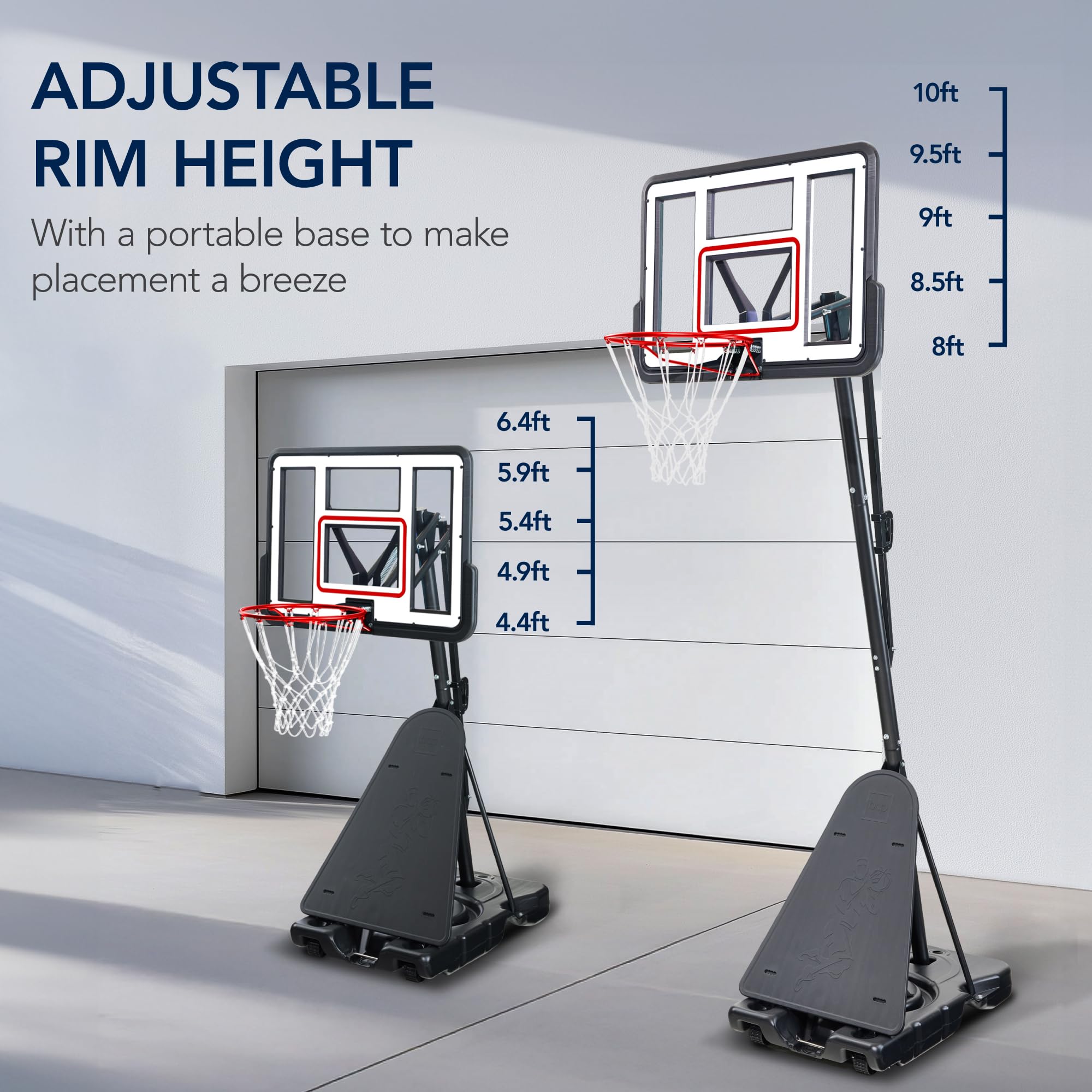 2-IN-1 GROW-WITH-ME HOOP: Easily adjusts from 4.4 to 10 feet for all ages and skill levels, while the front wheels make it portable, perfect for poolside fun at 4.5 feet