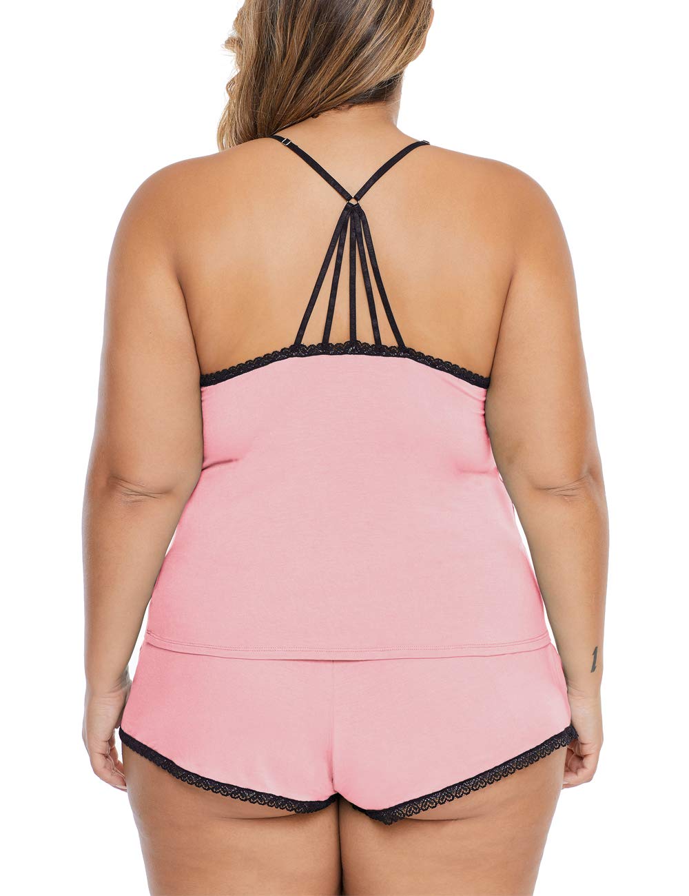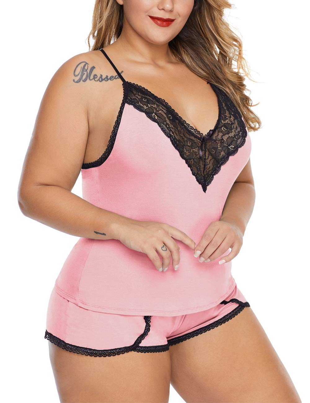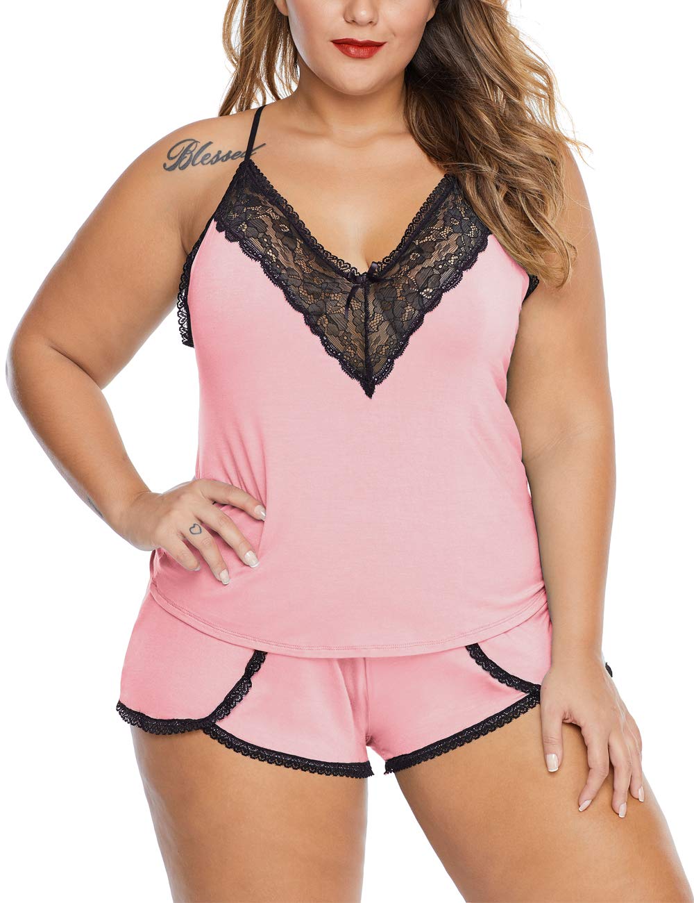 ❀ Features: Plus size cami shorts set,V neckline with lace patchwork and bow details, unique back design, adjustable spaghetti straps, sexy camisole short set, lace pajama cami set, sexy lace pj shorts for women with shorts makes you more sexy and noble.