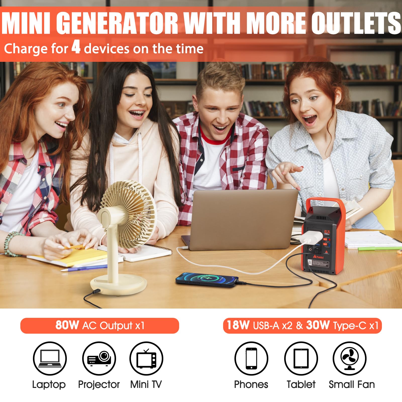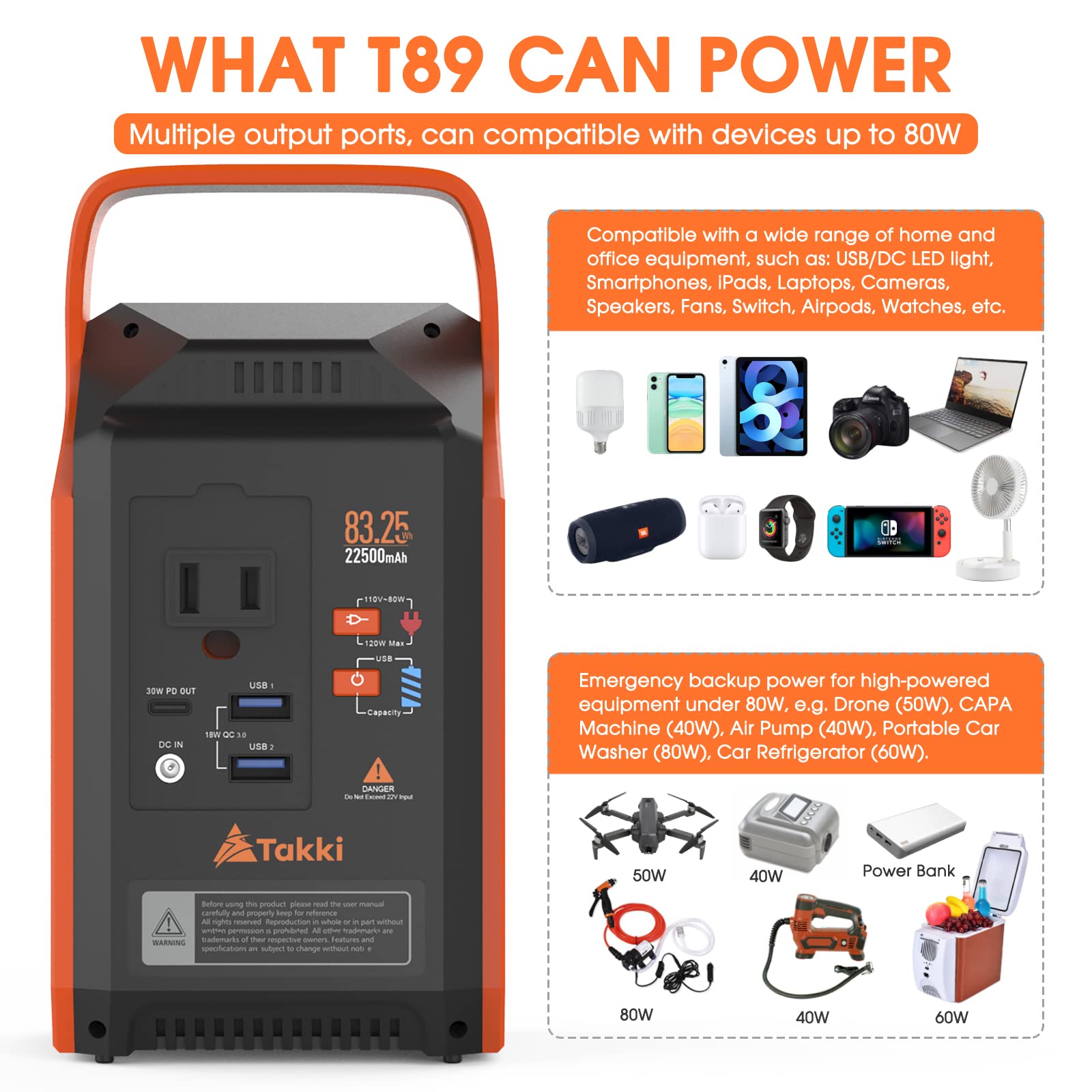 Versatile Power Source: Armed with a 22500mAh rechargeable battery pack, camping generator features 1x 110V/80W(Peak 120W) AC outlets, 2x USB port(18W QC3.0) and 1x USB C port(PD 30W) that deliver stable and secure power as you expect. It's a great choice for car tent, mobile office, hurricane emergency supplies, RV camping accessories, road trip must haves, home appliances
