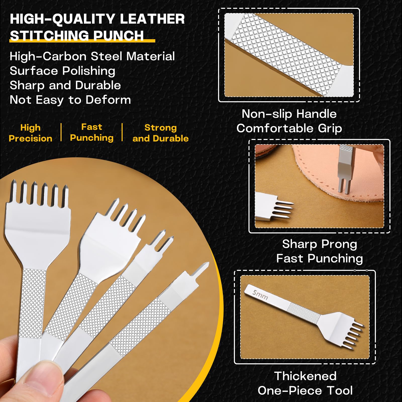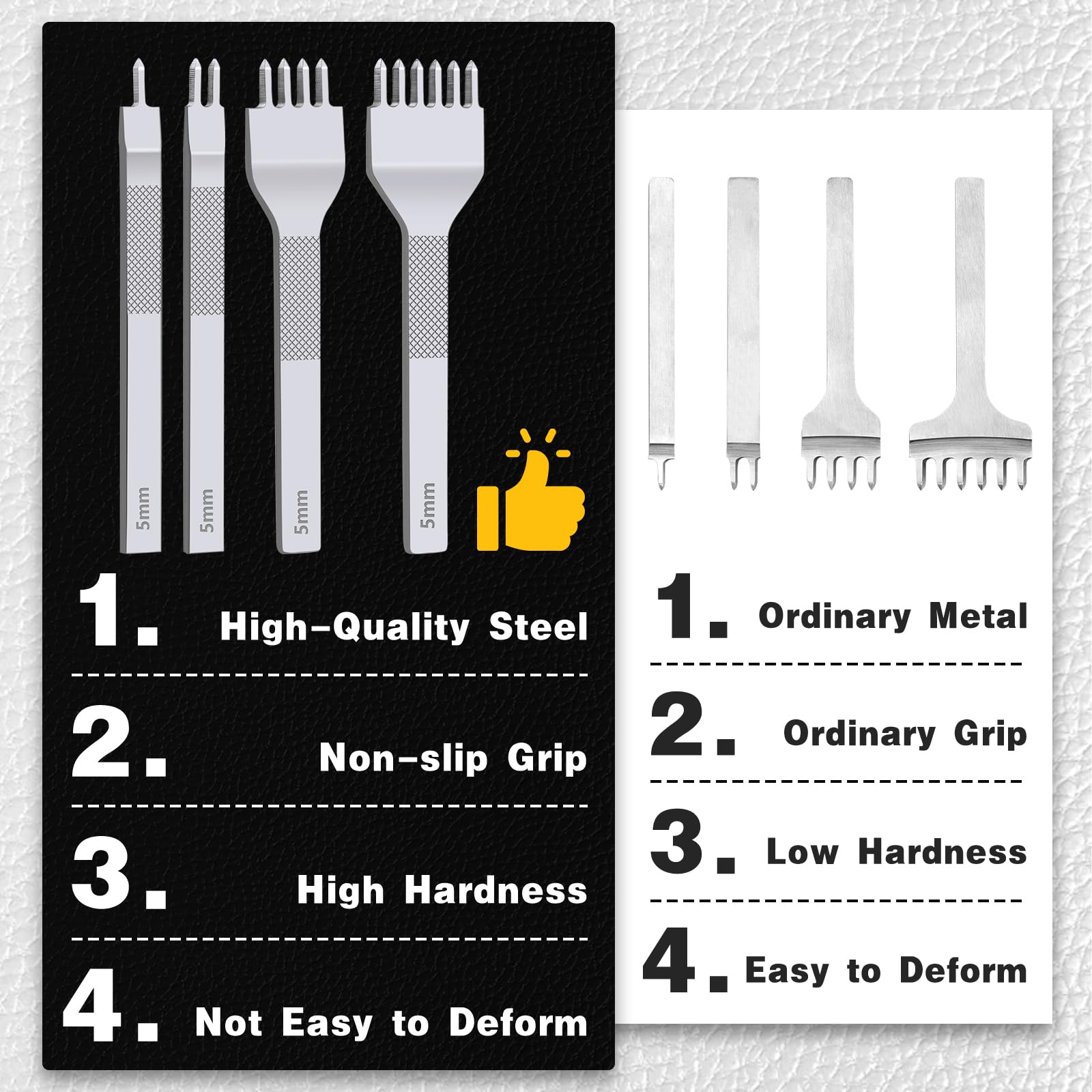 LACING STITCHING CHISEL SET: These 1/2/4/6 leather punches are made of high-quality steel for reliable performance, rust and corrosion resistance, and durability. After fine polishing, the handle is comfortable and the punch tip is sharp. Each punch stitching hole tool has a sharp, well-defined prong to help punch quickly, which can create clean and accurate holes to make your stitches even and beautiful