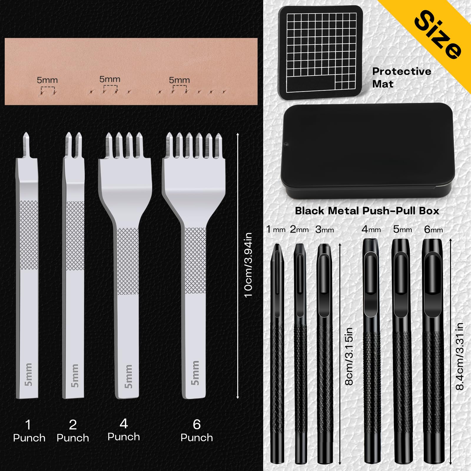 LEATHER PUNCH TOOL: You will get a 5mm 1/2/4/6 leather stitching punches set, 6 hollow punches with different sizes, a cutting mat, and a black metal push-pull box. This is a very practical stitching punch set. All the leather punch tools are packed in a metal push-pull box, which is neatly stored and easy to carry