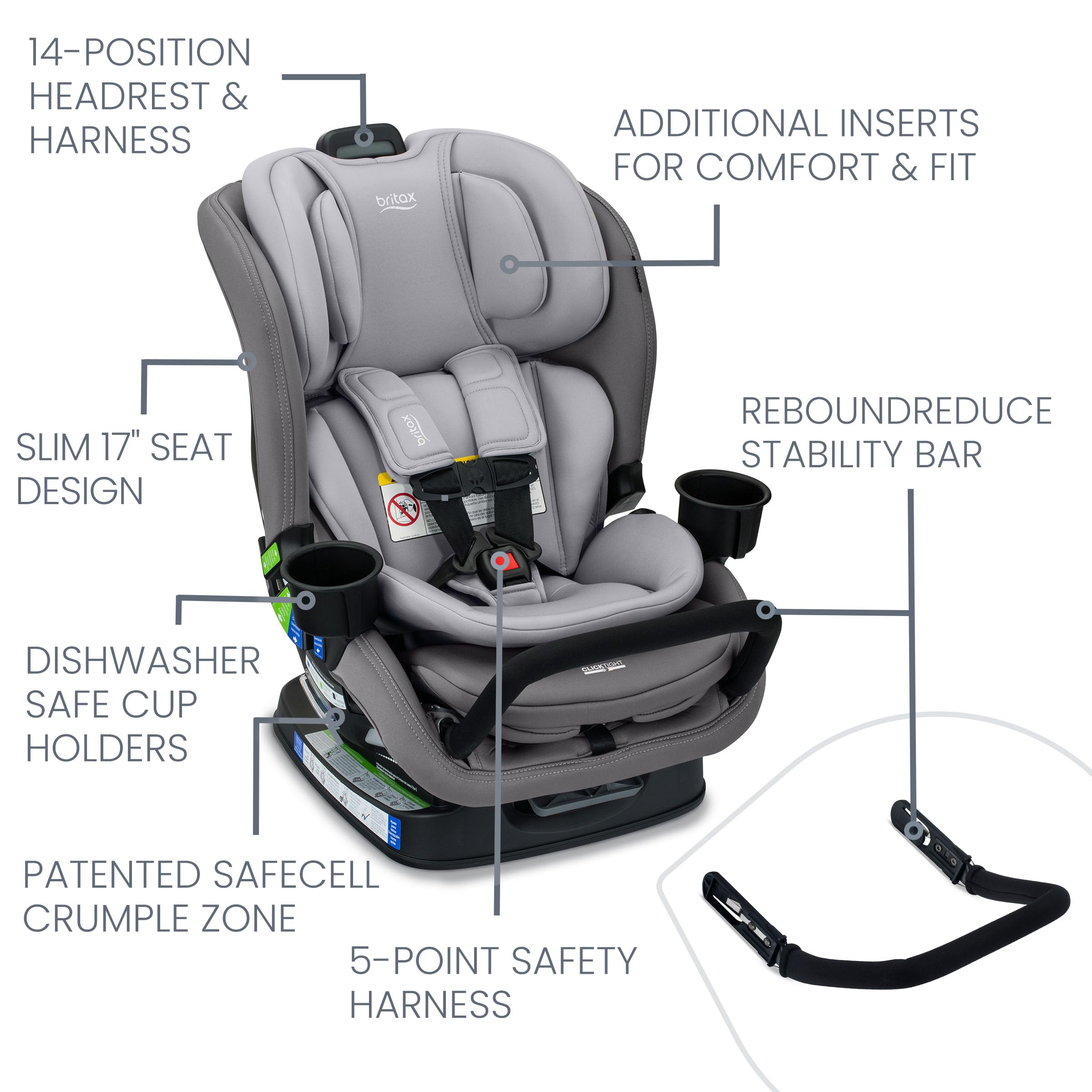 Britax Safety: The carbon steel frame and SafeCell crumple zone help absorb crash energy, and a patented V-shaped tether helps slow forward movement