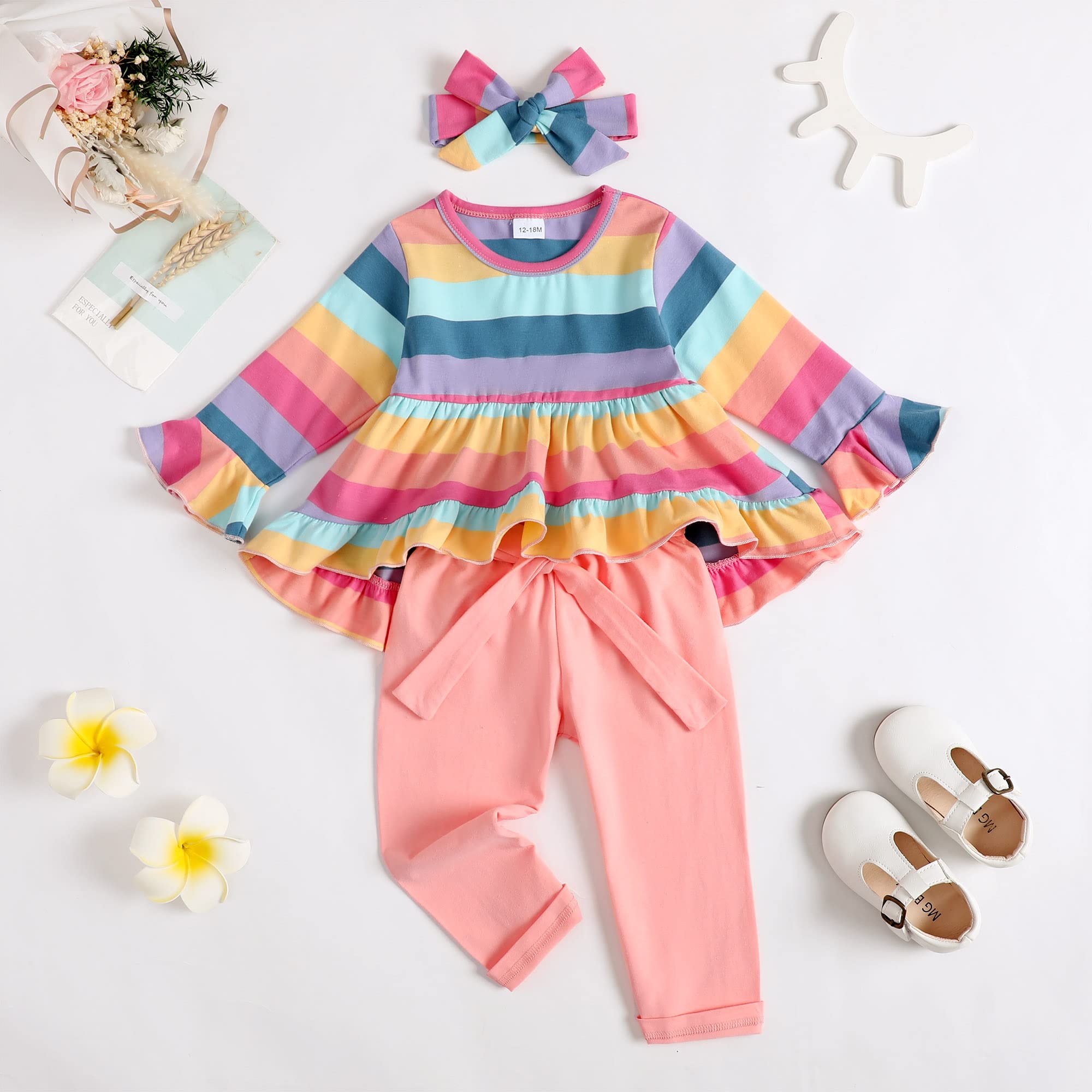 3 Pieces Toddler Little Girl Outift for Fall Winter: 1pc baby girl shirt + 1pc baby girl pants + 1pc untied headband