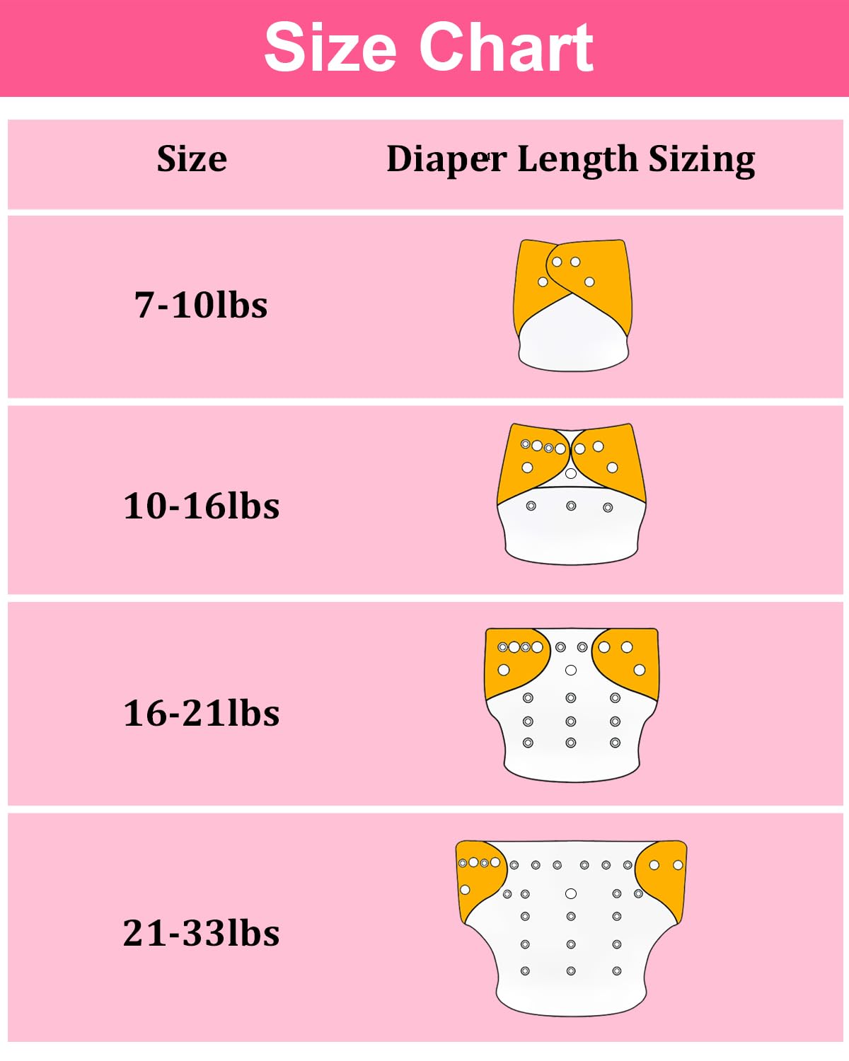 One Size fit 0-2 Year Babies: Covers with adjustable snaps fits babies or toddlers from 7 to 33 pounds and grows with your little one. You can adjust the diaper to your desired size (S, M or L) by snapping onto different rows of buttons on the diaper covers.