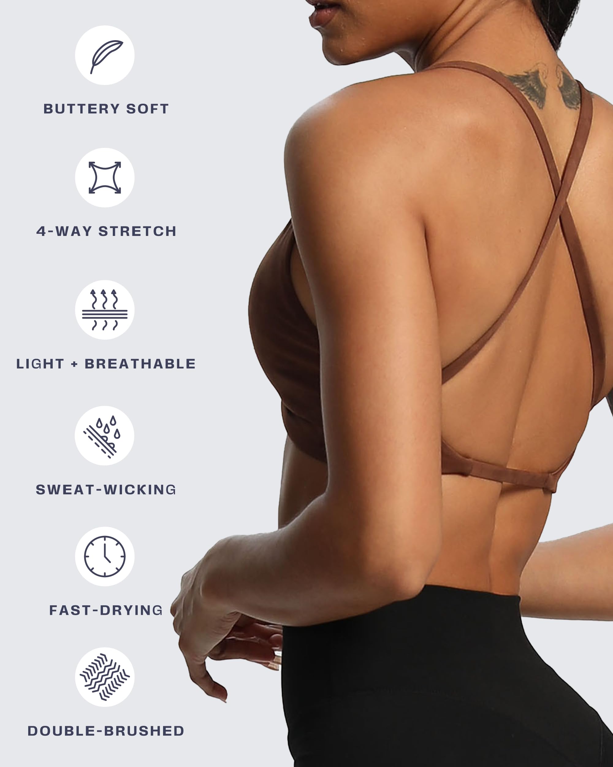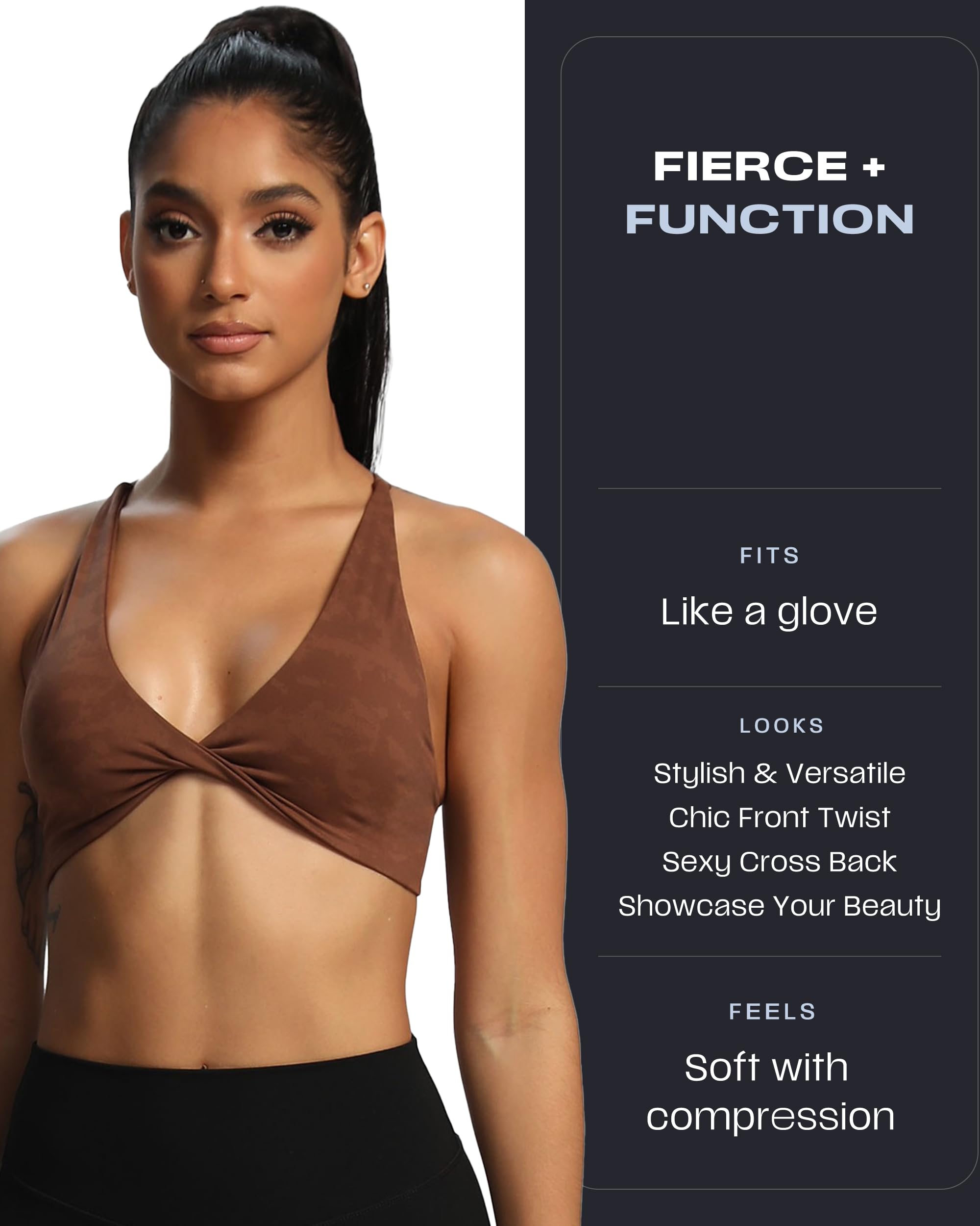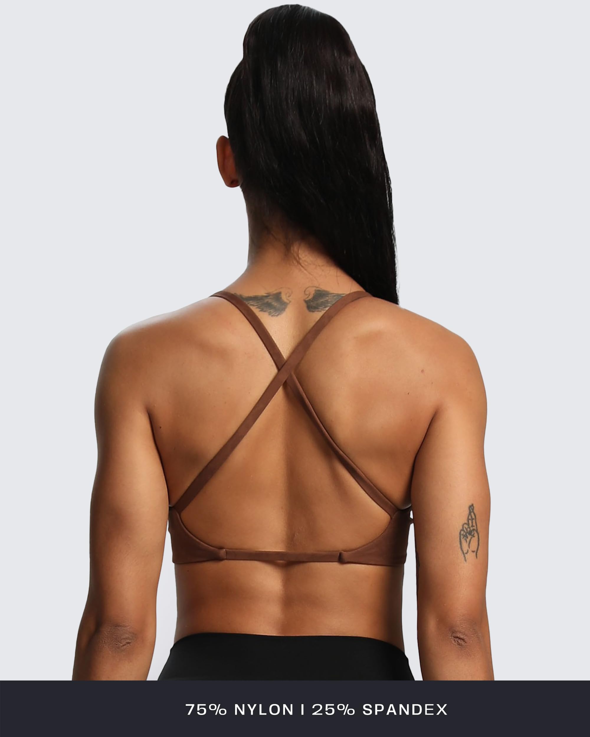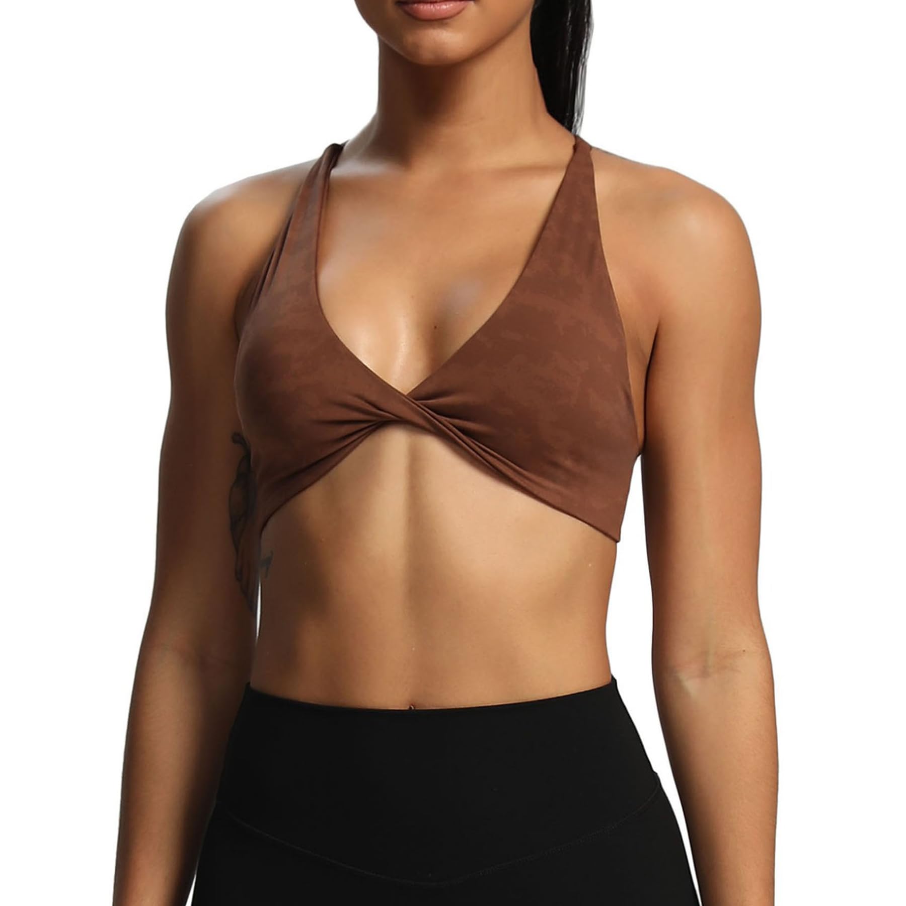 The Sienna twist womens sports bra featuring thin crossed back straps and padding, despite small straps, it doesn’t bite into your traps and cause neck pain