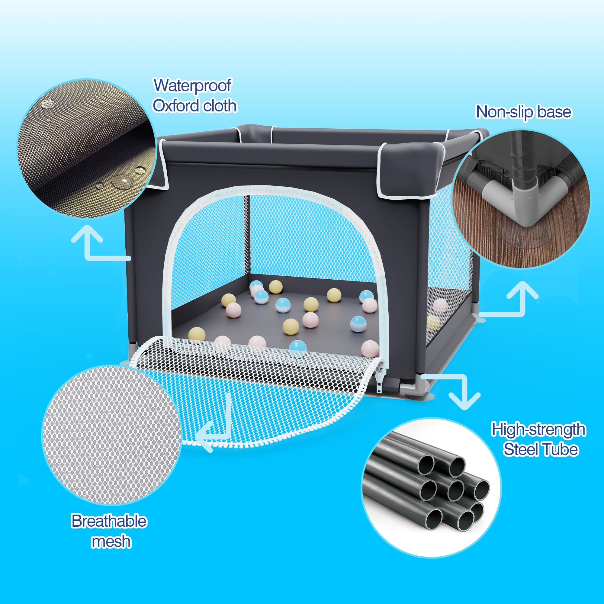 Comfort and Convenience: The baby playpen is equipped with padded handrails for added safety, while the bottom is made of non-slip, breathable, and quick-drying fabric, making it easy to maintain and keep clean.