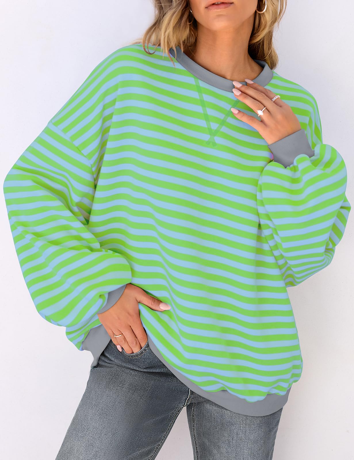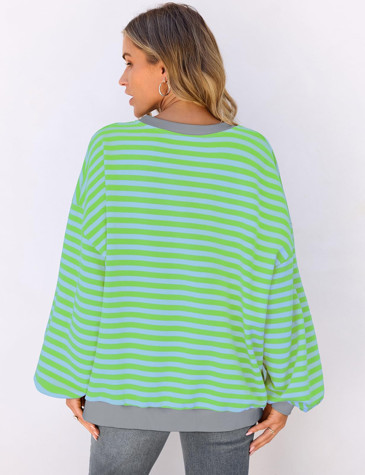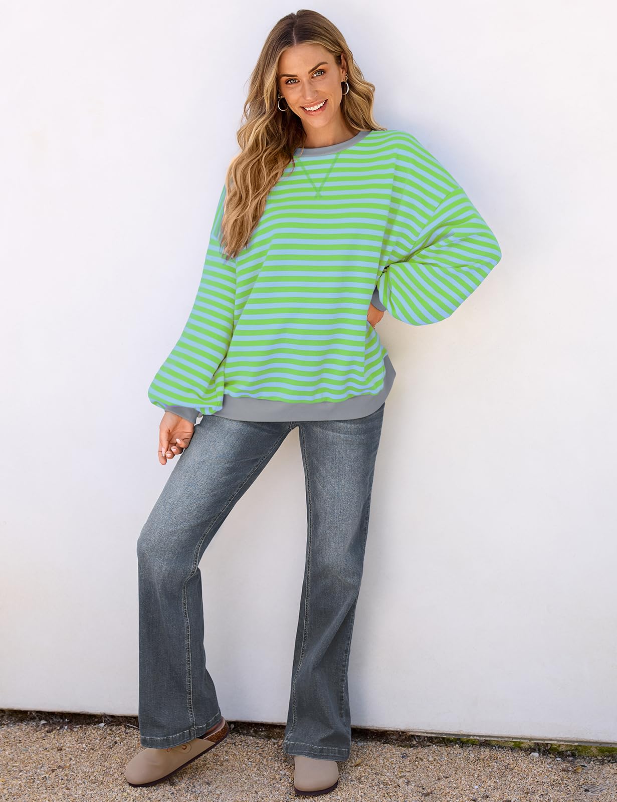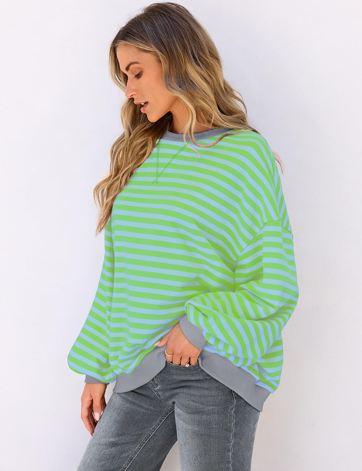Matching Outfits: Oversized striped sweatshirt can be easily paired with various bottom options including shorts, skirts, jeans, leggings, and pants, along with sneakers and casual shoes. They also complement outerwear such as jackets, coats, vests, and cardigans.