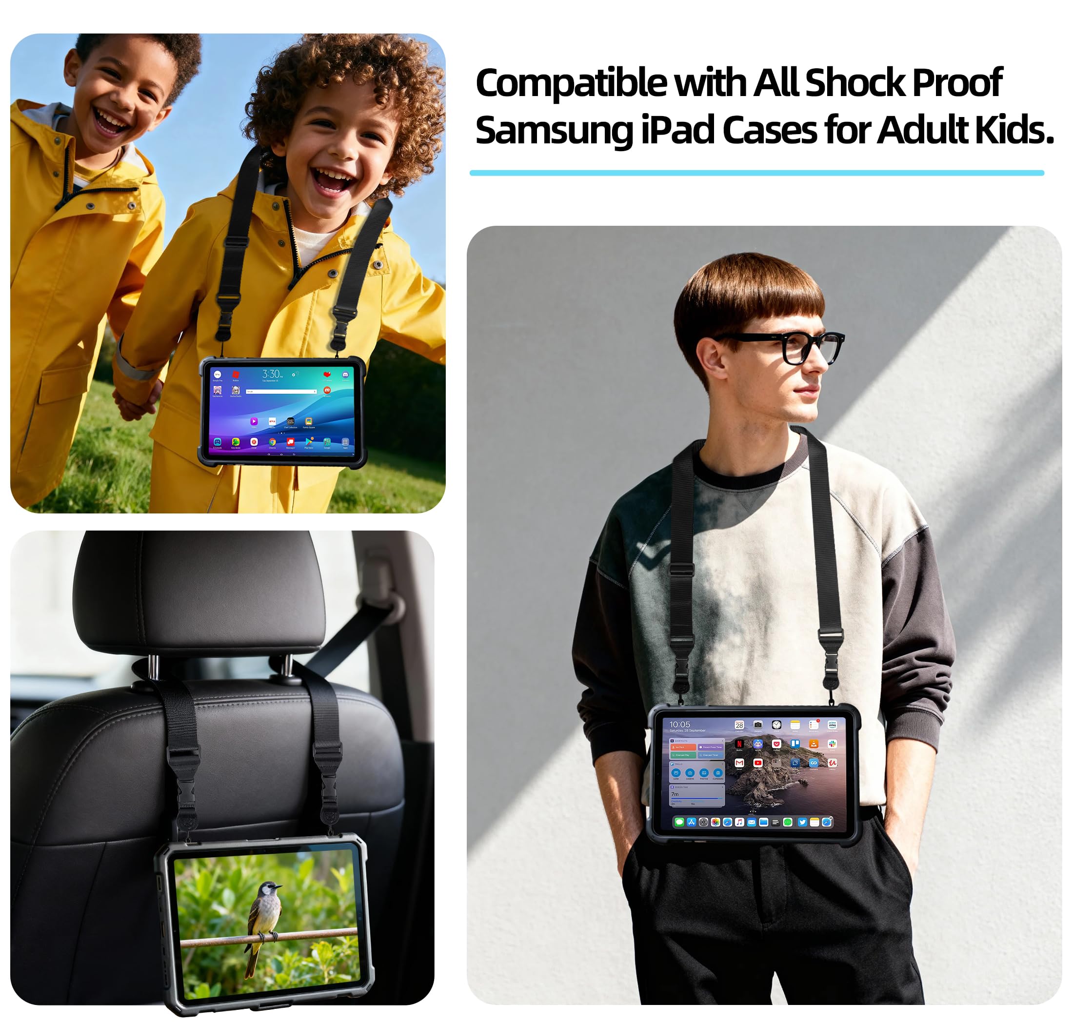 Adjustable iPad Strap:The iPad shoulder strap is adjustable from 32 to 61 inches and can be easily adjusted as needed. The surface is smooth and durable, and the comfort is strong.Great for adults and kids. Also suitable for use on car seat chairs
