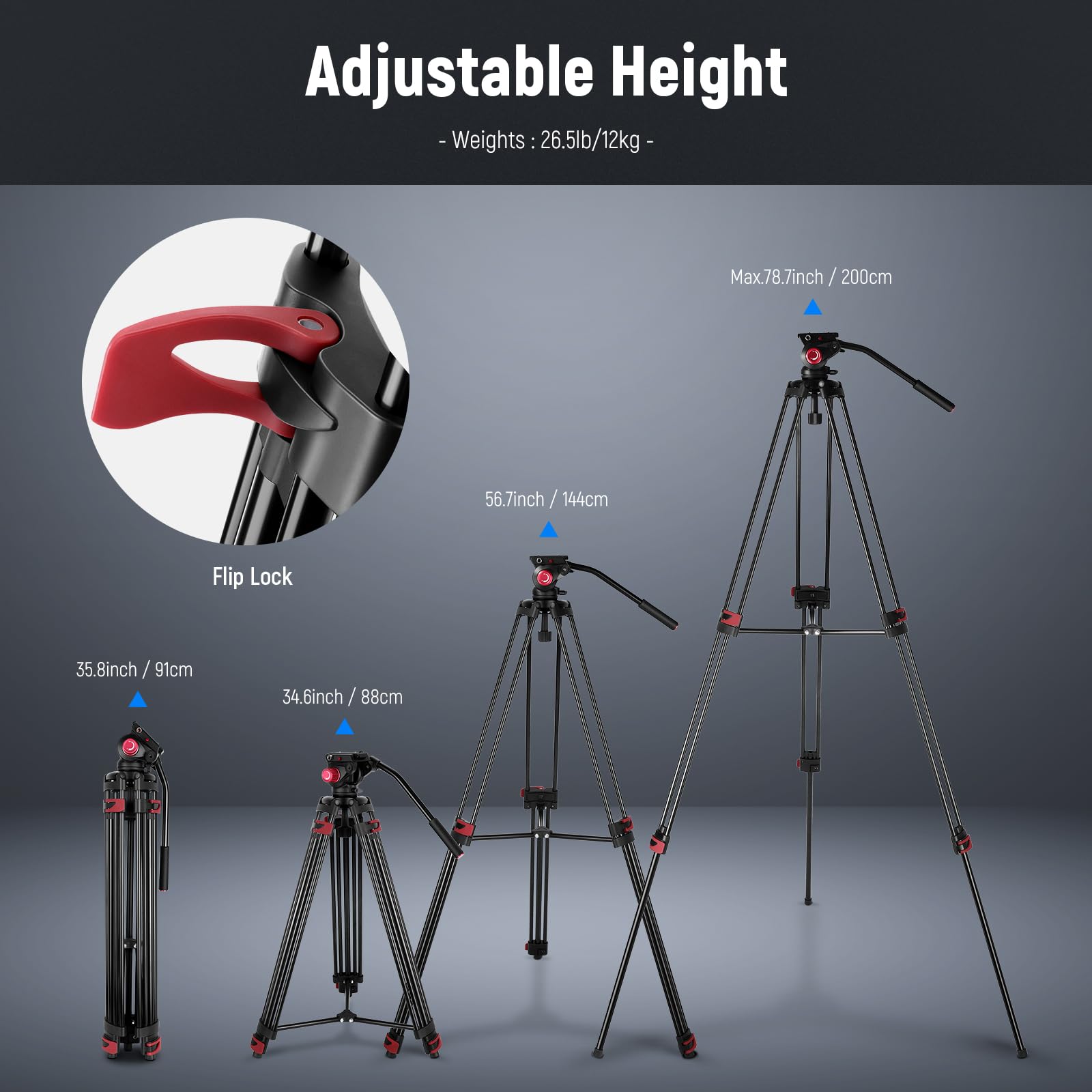 【Adjustable Height & Easy to Carry】 The strong flip locks allow the user to conveniently and easily extend and secure the legs. Use this locking mechanism to adjust the height of the tripod from 34.6"/88cm to 78.7"/200cm. Fold the tripod down to 35.8"/91cm and store it away in the included tripod bag for easy storage and transport
