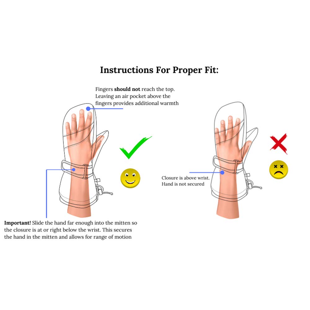HOOK & LOOP CLOSURE Strap Hook & Loop closure give these mittens a tight sealed fit. Stop worrying about your kid and toddler snow gloves slipping off. The EXTRA LONG CUFF effectively keeps cold air & snow from getting into these kids' waterproof mittens. The long cuff stops the snow from getting in at the wrist. Cold weather doesn't stand a chance! Did we mention that these mittens WILL NOT FALL OFF? (*For moms of superman toddlers: please see our mitten clip listing!)