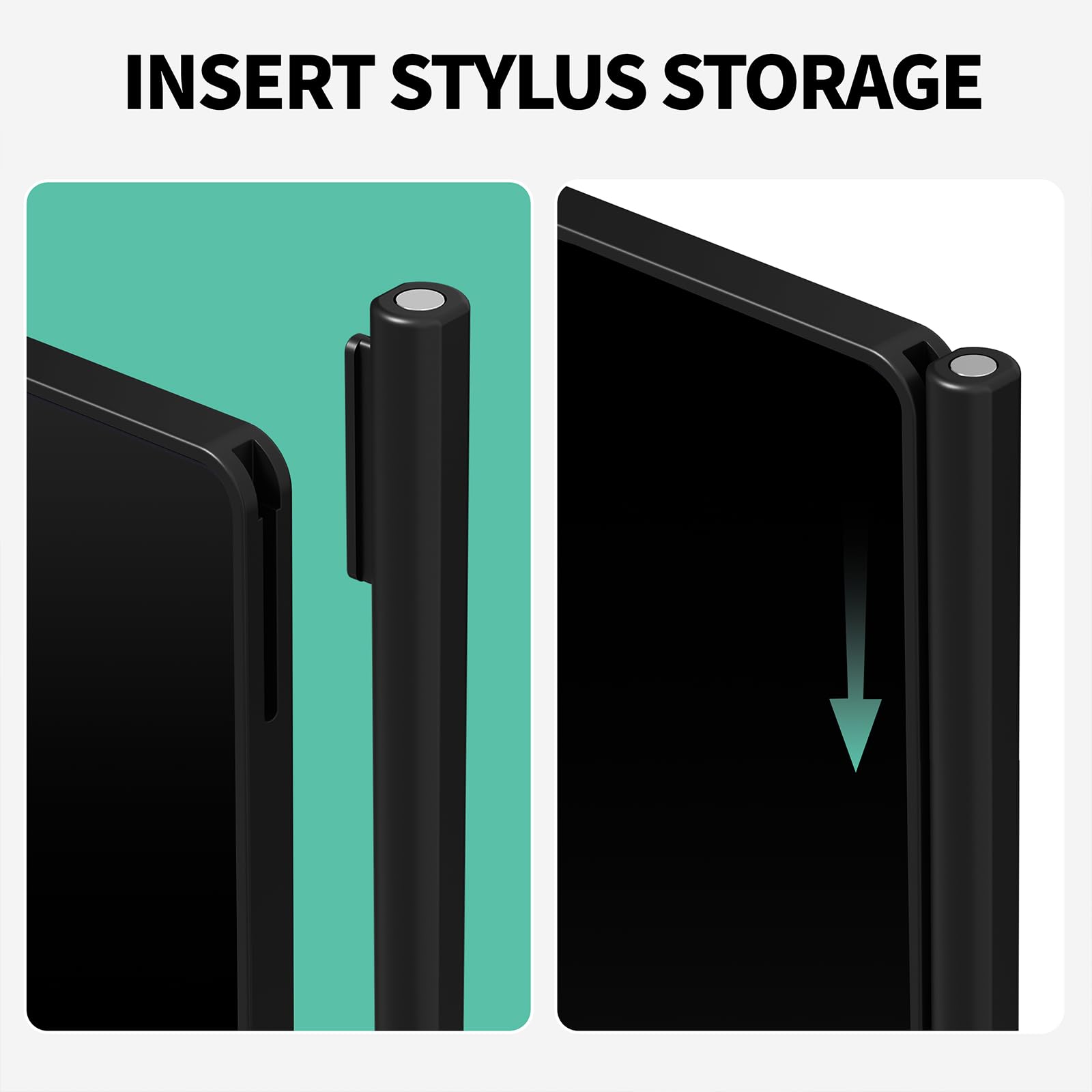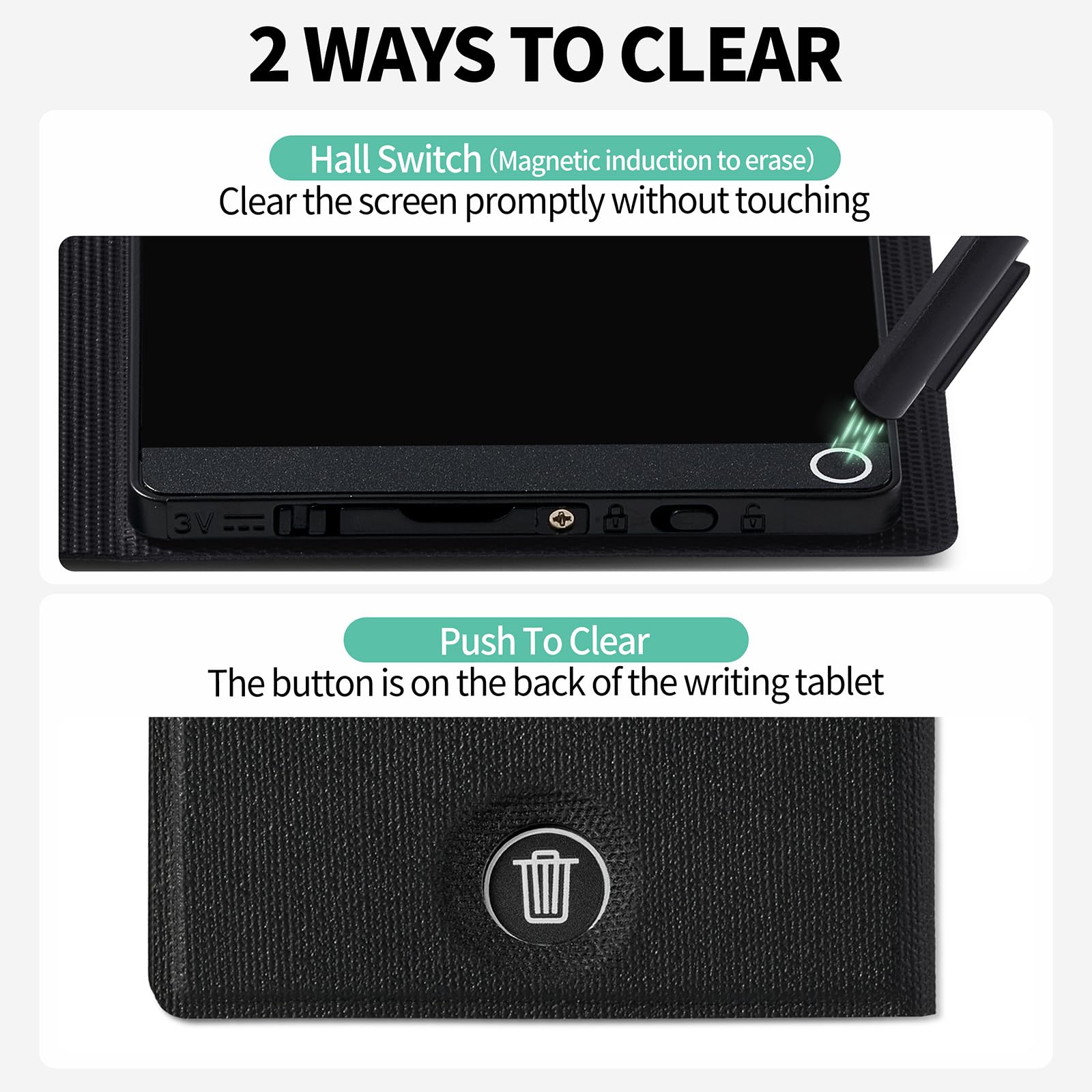 2 Ways to Clear: LCD writing tablet in the traditional push button clearing mode, add a new non-touch screen clearing mode; Use the end of the magnetic pen to move closer to the circle on the front of the drawing board to clear the screen; The 2 ways can clear the screen content instantly