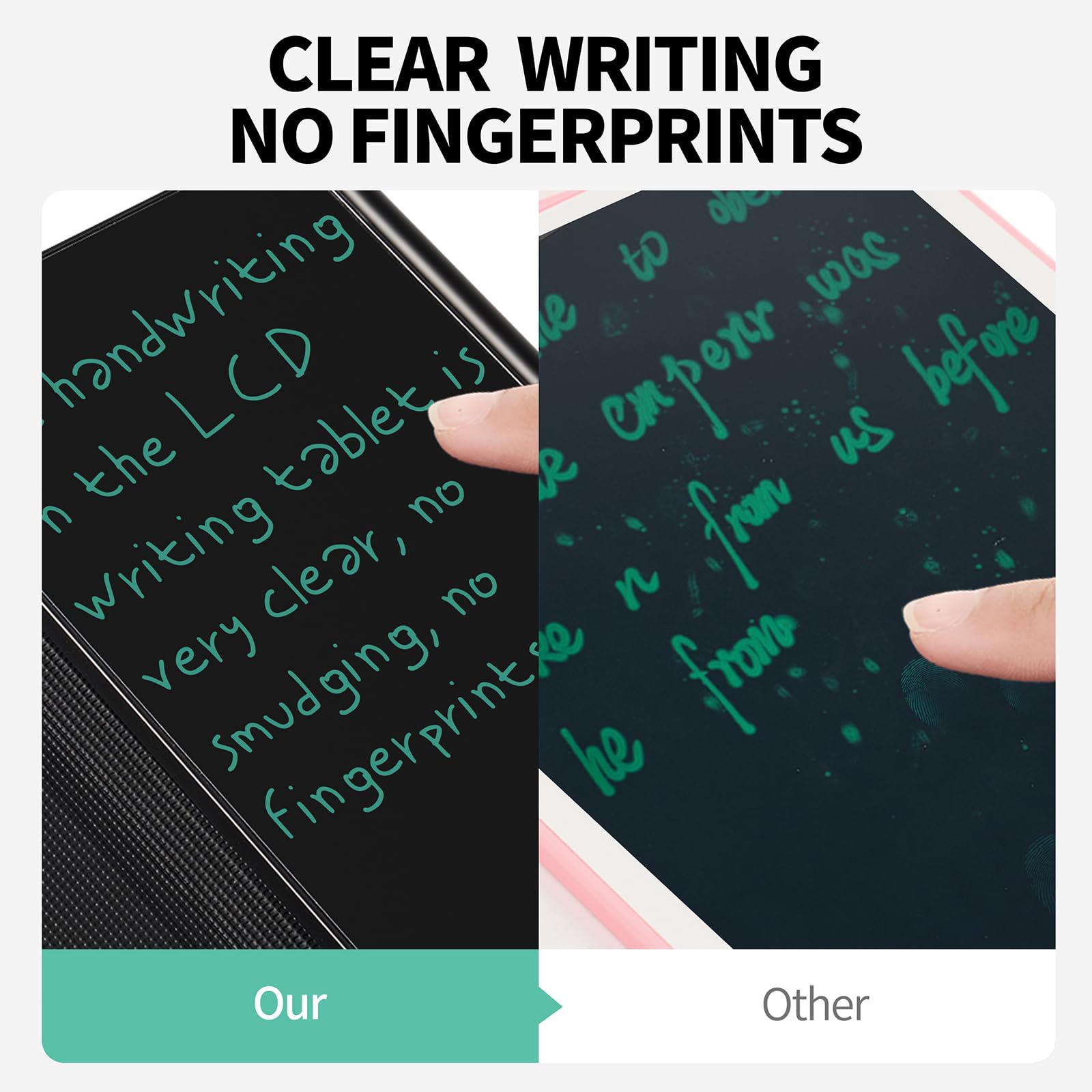 Eye Protection: The drawing tablet features LCD pressure sensitive technology, so there is no blue light and no radiation; It's safe and comfortable to use for a long time; Stylus pen can writing a blue-green color handwriting lines, which are clear and eye-catching; Unlike others, there's no fingerprints or press mark left on the screen, giving you a better writing experience