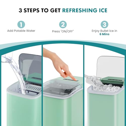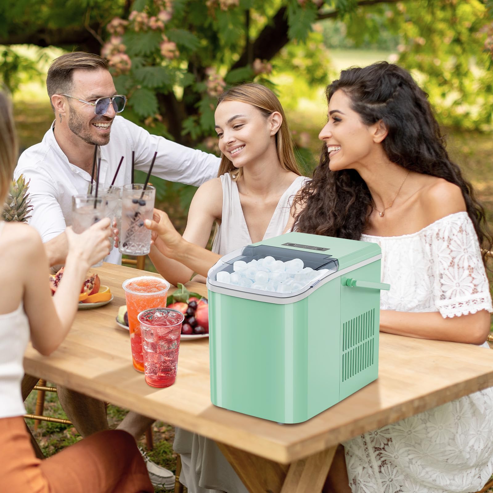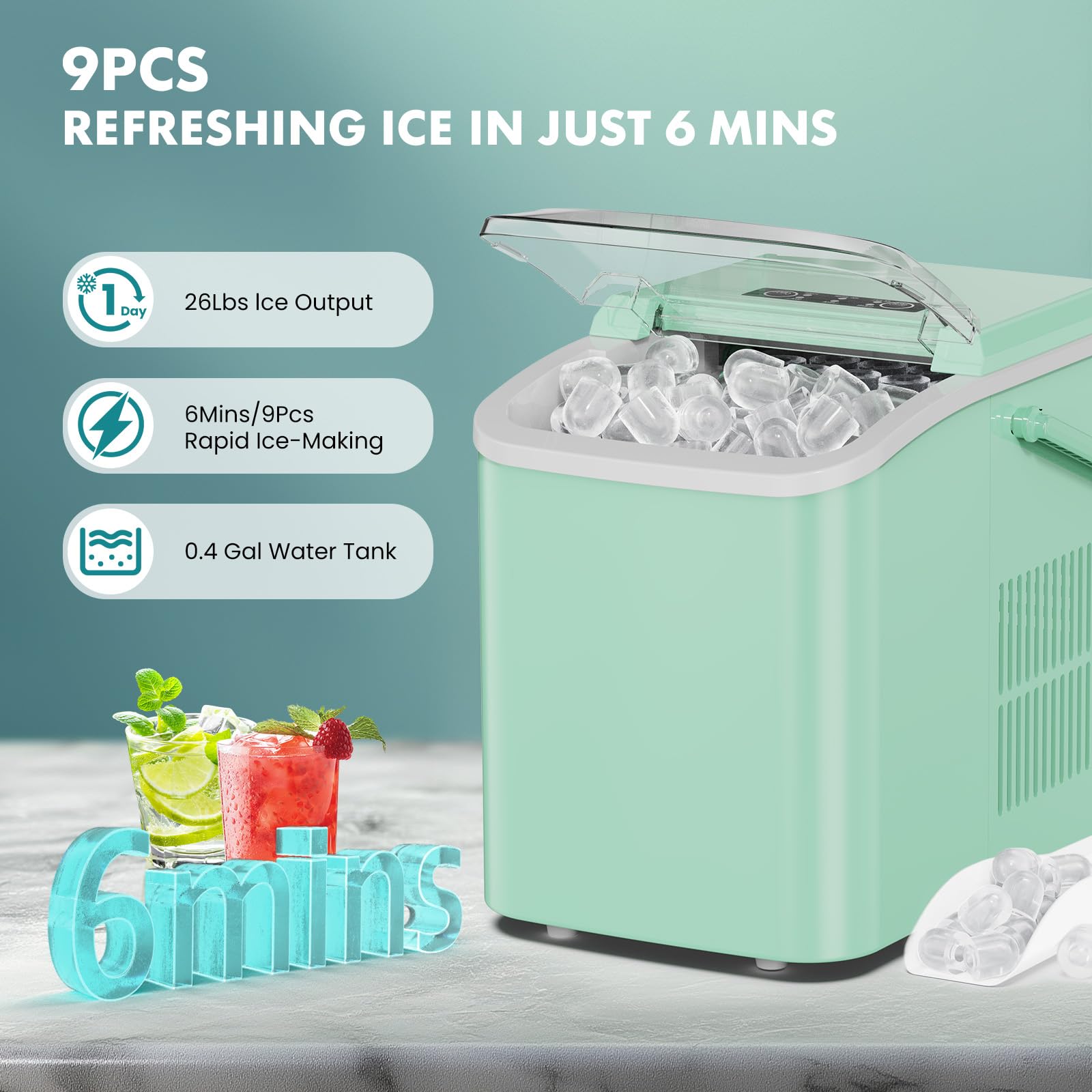 Fast Ice Making:The countertop ice maker can produce 9 fresh ice cubes in just 6 minutes, allowing you to enjoy fresh ice and cold drinks in no time. Equipped with a 1.5-liter water tank, ice cube maker can easily produce 26 pounds of ice per day, making it the ideal choice for enjoying a cool summer.
