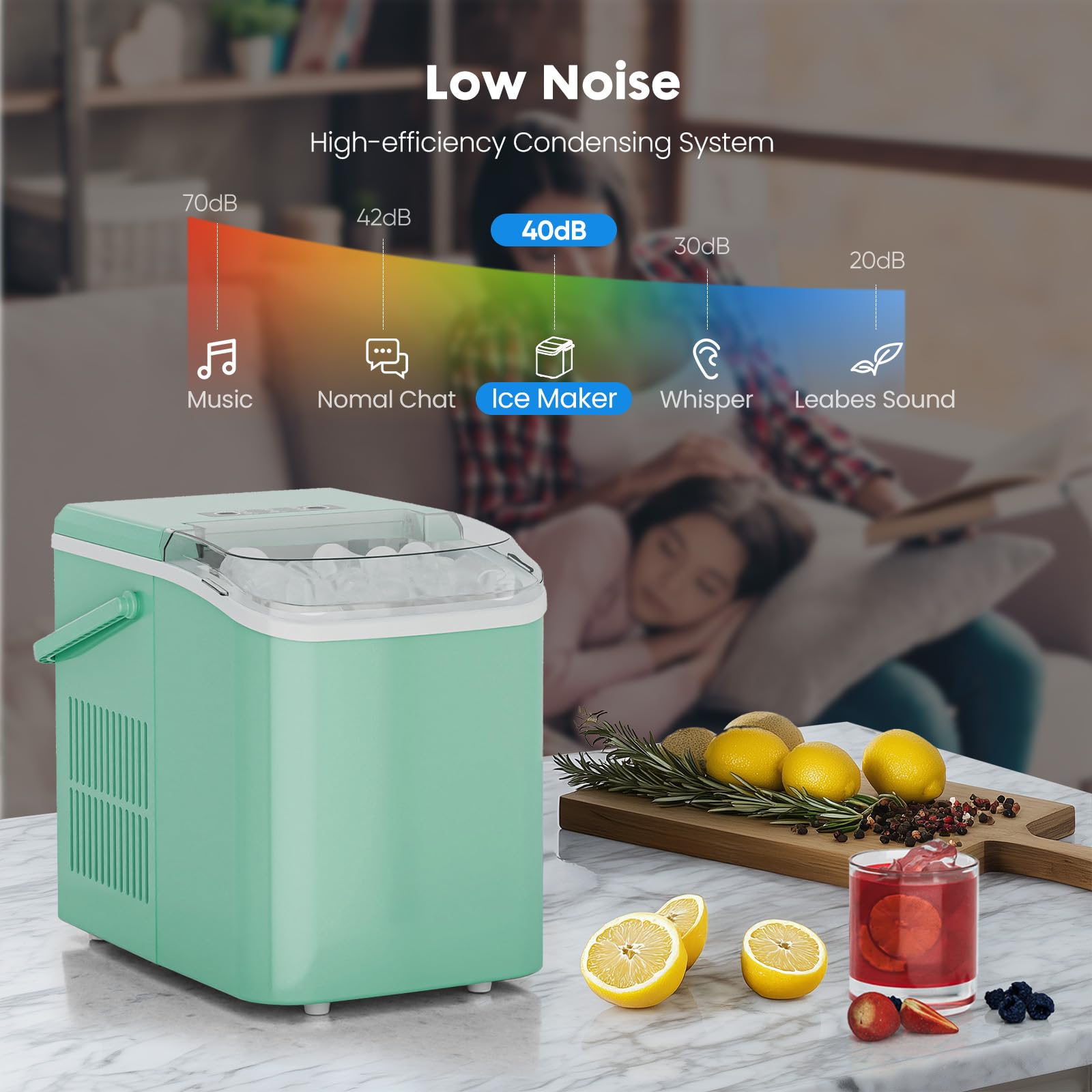 User-Friendly Operation: The clear ice cube maker control panel is designed for effortless use—just follow three simple steps to enjoy fresh ice cubes in no time. Intuitive indicators light up to signal when the water tank needs refilling or the ice bin is full. During operation, the portable ice maker operates at a noise level below 40 decibels.